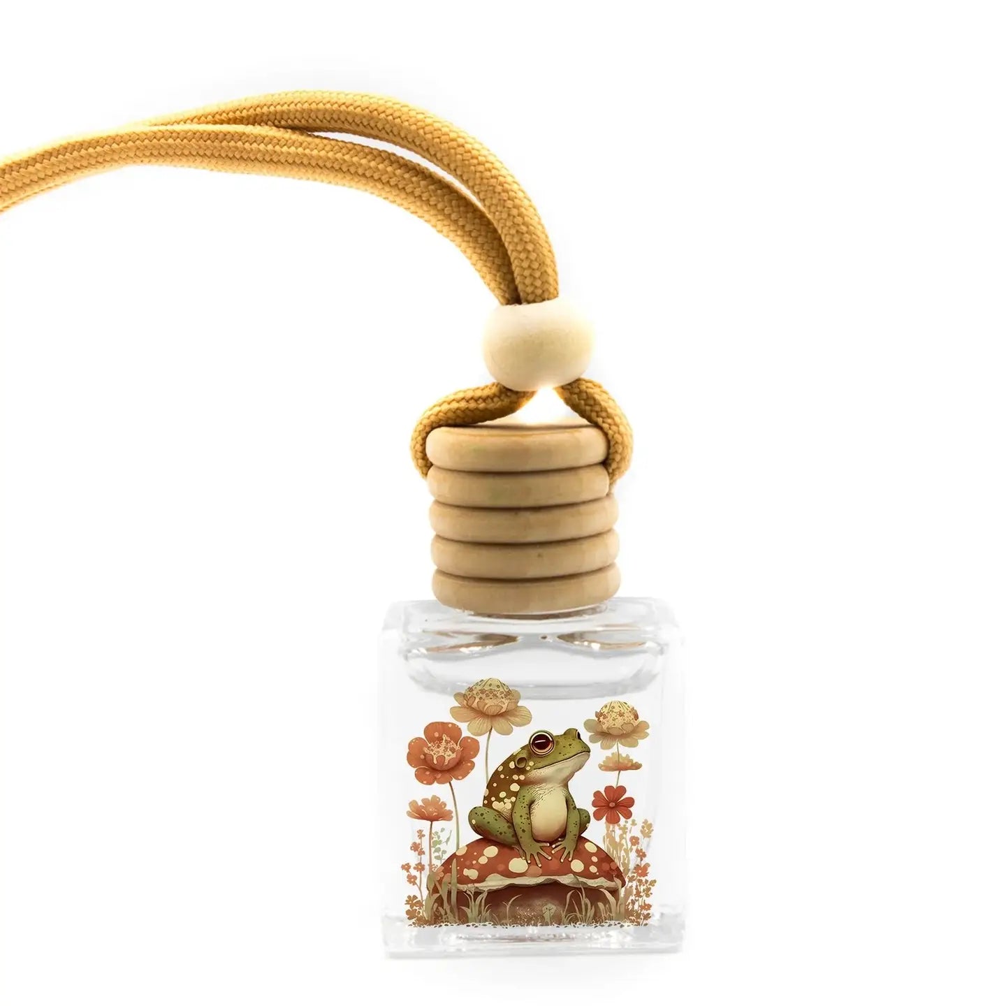 Fragranced car diffuser oil housed in a clear glass rectangular bottle with a wooden top, and cord.