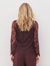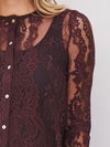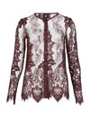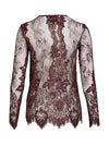 This top is made in transparent lace with a detailed flower and border pattern, creating a romantic and elegant expression. It features a round neckline, long sleeves, and a full button closure at the front. The raw, wavy edges at the hem and sleeves emphasize the craftsmanship and add an exclusive finish.