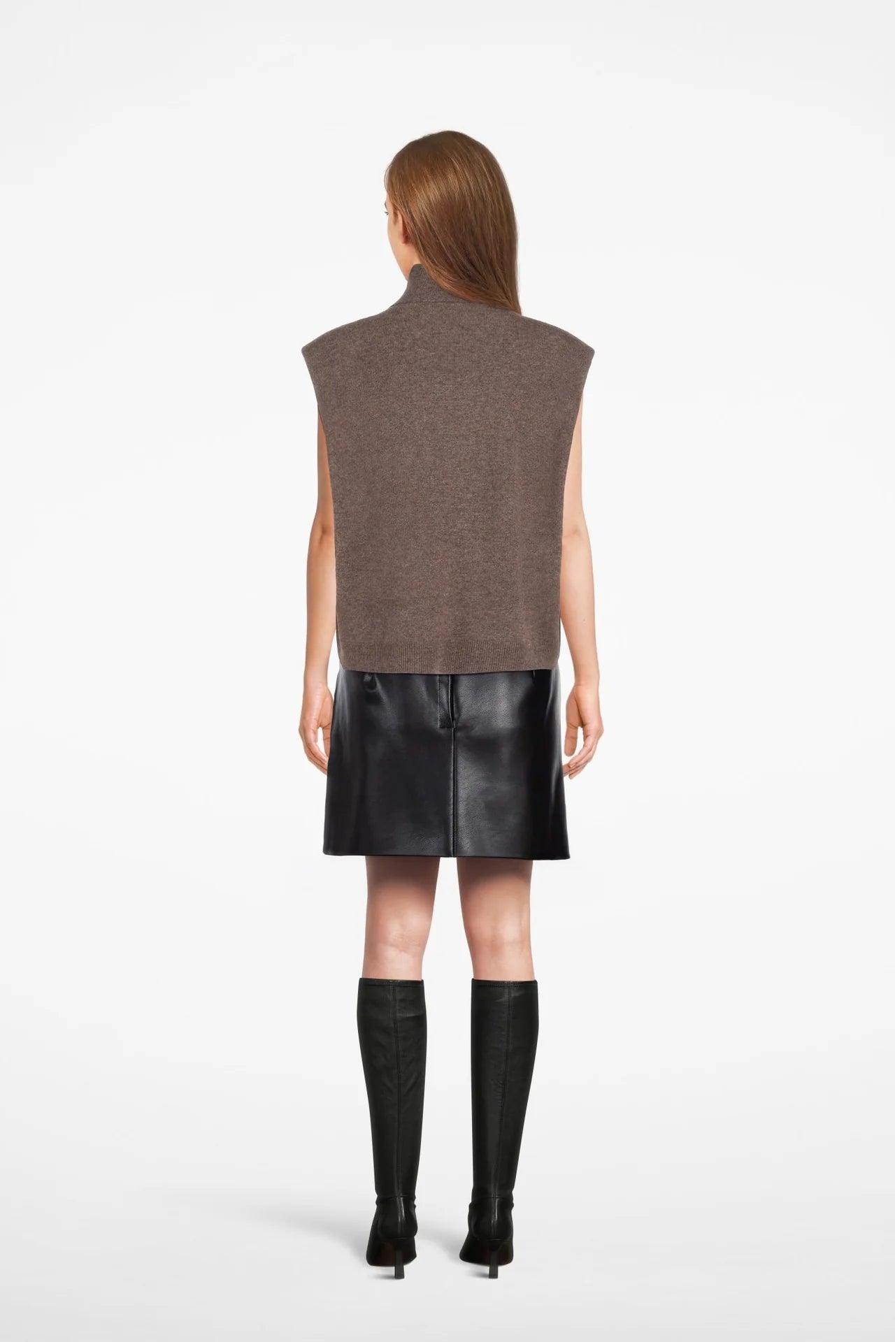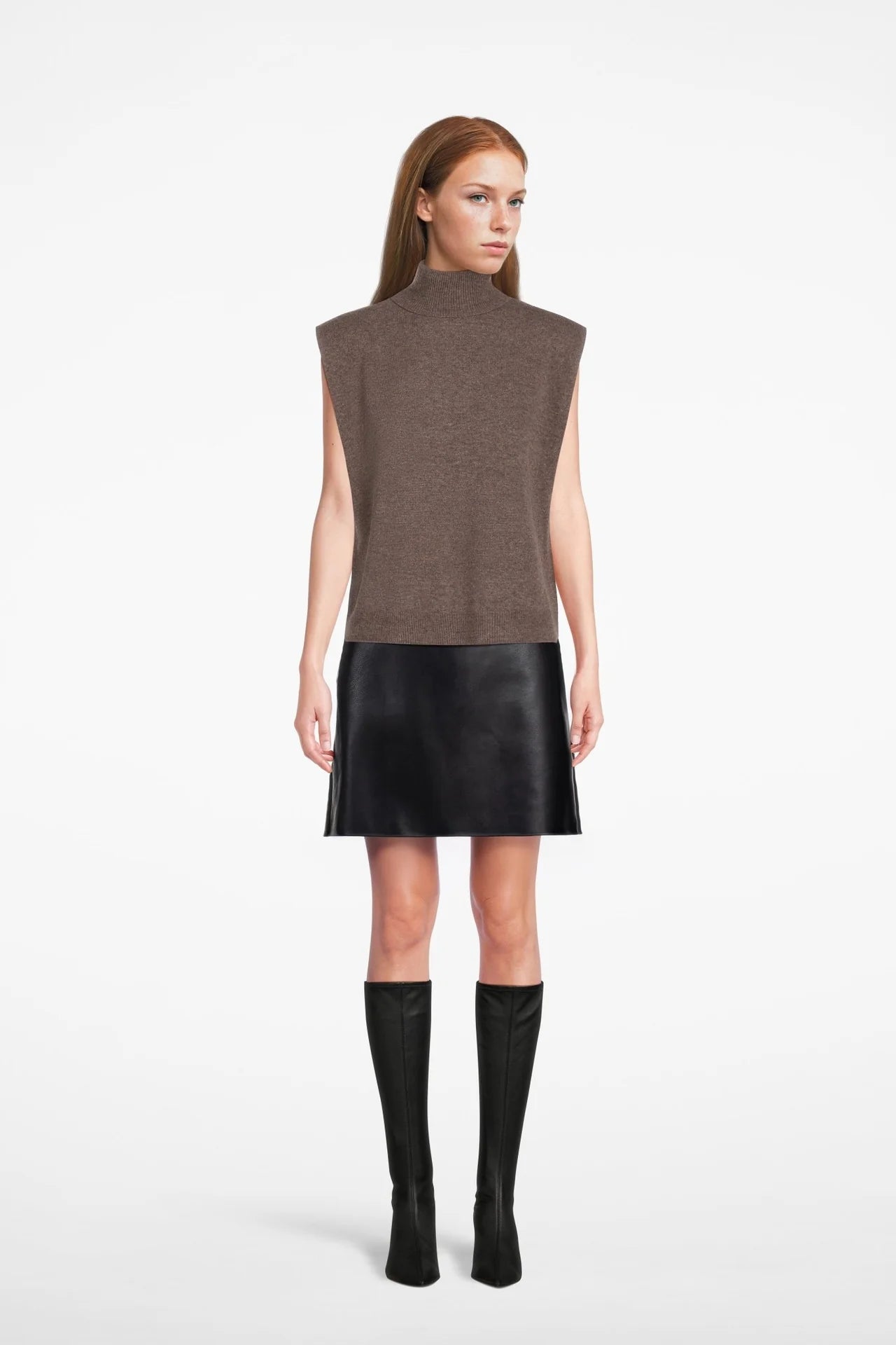 Effortless structure with modern ease. The Arolla Oversize Sleeveless is a sleeveless wool knit top designed with soft shoulder pads, a sleek mock neckline, and a seamless finish. Its oversized fit makes it perfect for layering over shirts or turtlenecks, offering a contemporary yet elegant silhouette. • Seamless construction for smooth comfort • Shoulder pad detail for subtle structure • Mock neckline for a modern finish • Oversized fit for relaxed styling • Clean armhole finish for layering ease •