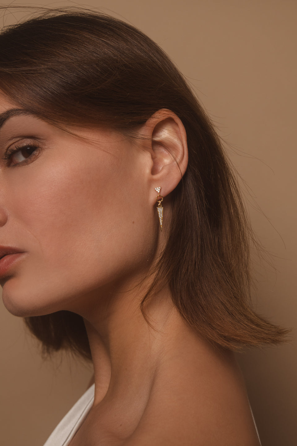 Crystal embellished spikes are suspended from hammered 18k gold filled rings, atop pave triangle posts. These earrings are both edgy and elegant.