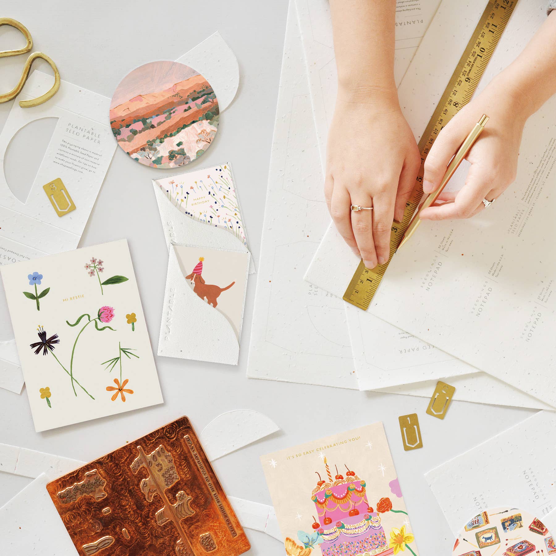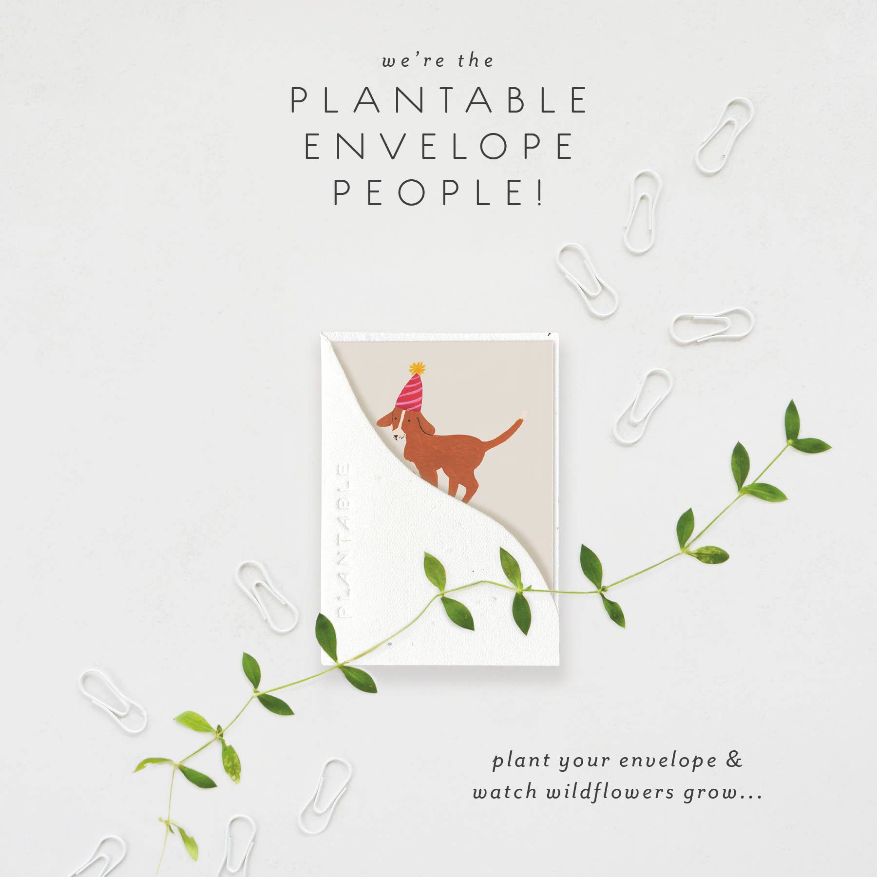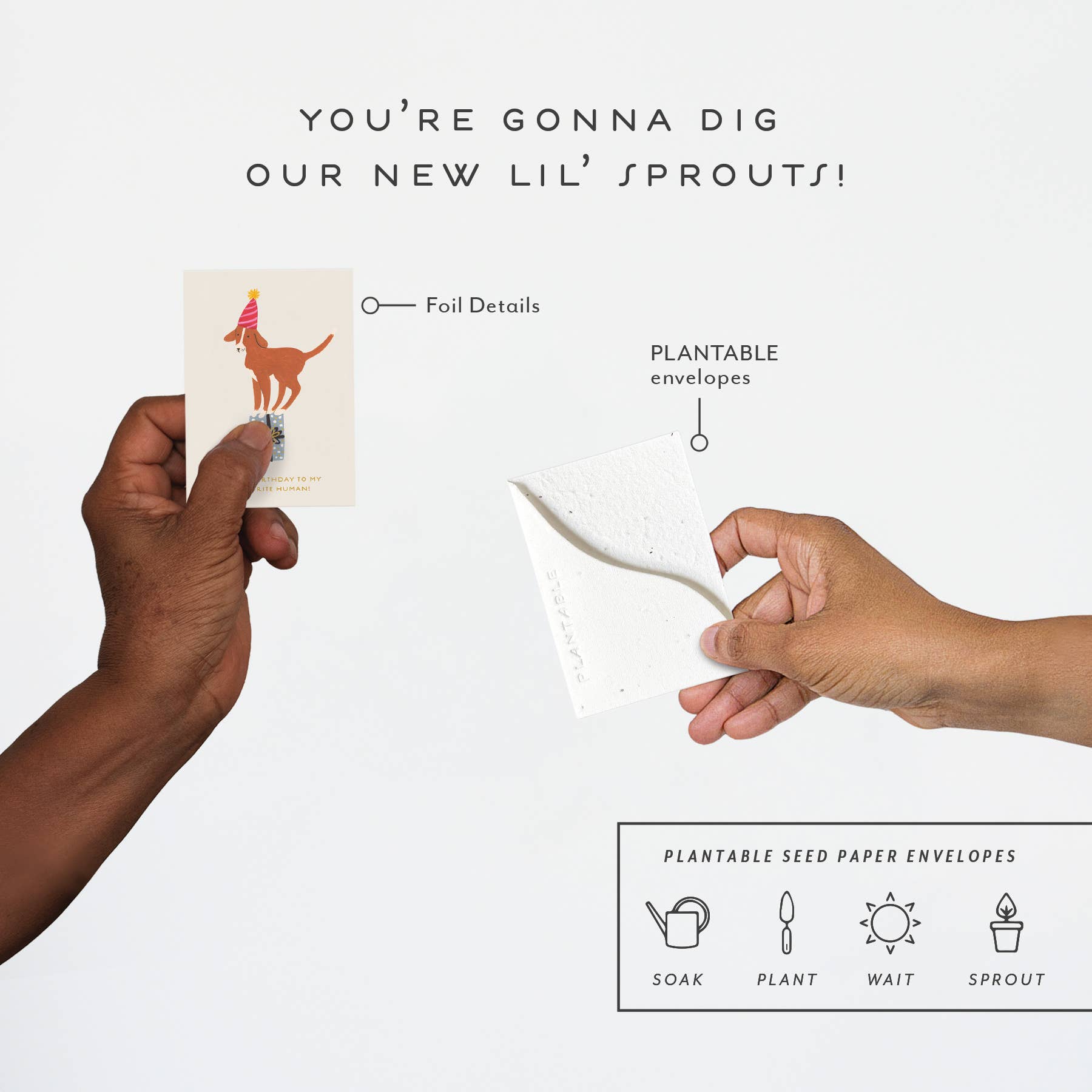 Meet the newest little SPROUT! Think all the goodness of our full size greeting card BUT at a petite "mini me" and super cute enclosure card size. All Seedlings sprouts have foil details and a PLANTABLE seed paper envelope which is embedded with wildflower seeds. This seed paper is made of a biodegradable eco-paper created with post-consumer materials - no trees harmed for this paper! When planted, our envelopes compost away leaving only flowers behind. Blank inside, our mini greeting cards are printed on premium paper and are all accented with foil details. Need a display? Order SPRDIS24 for a 24 pocket tabletop spinner. Card size: 2.5" x 3.5" All Seedlings cards are made in the U.S.A.