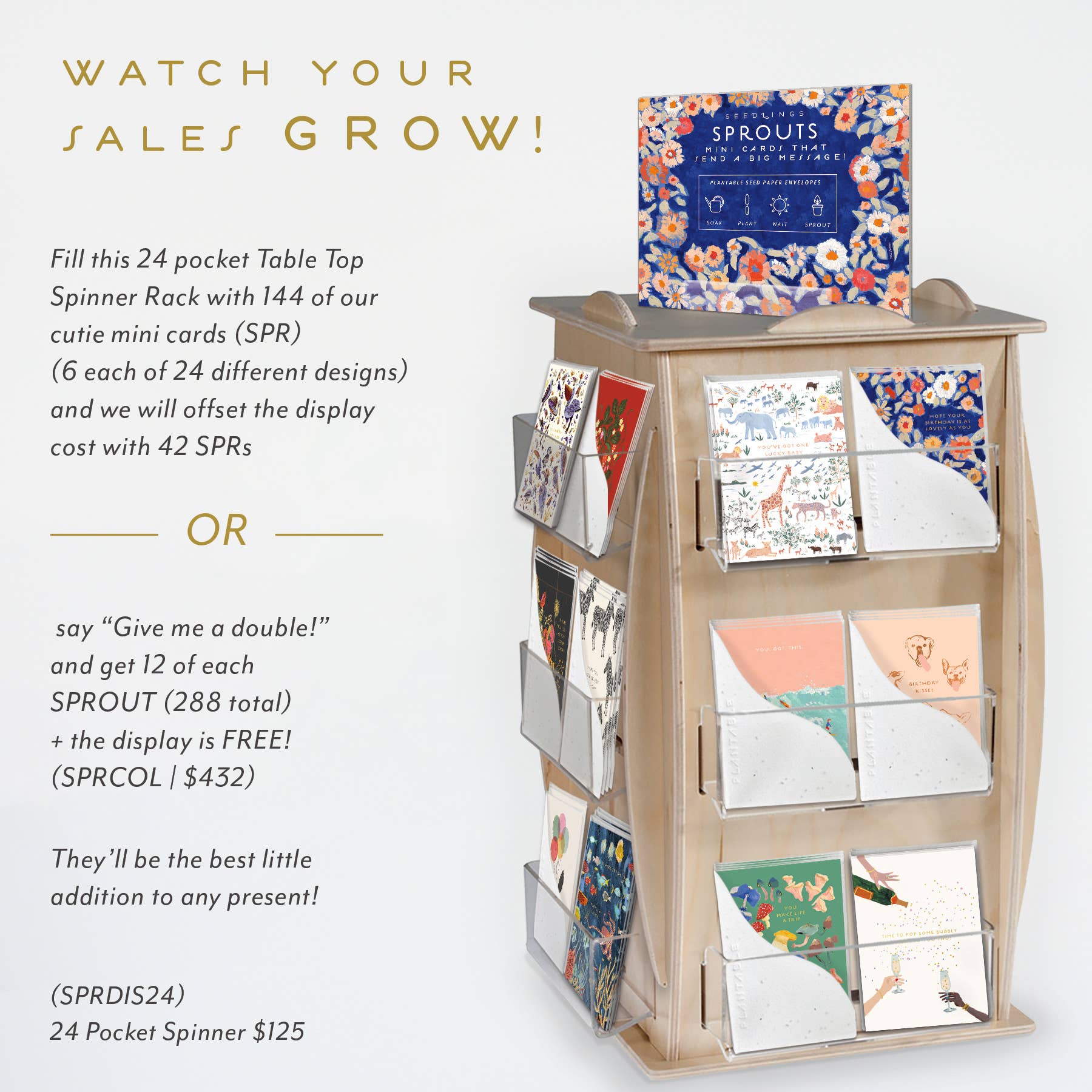 Meet the newest little SPROUT! Think all the goodness of our full size greeting card BUT at a petite "mini me" and super cute enclosure card size. All Seedlings sprouts have foil details and a PLANTABLE seed paper envelope which is embedded with wildflower seeds. This seed paper is made of a biodegradable eco-paper created with post-consumer materials - no trees harmed for this paper! When planted, our envelopes compost away leaving only flowers behind. Blank inside, our mini greeting cards are printed on premium paper and are all accented with foil details. Need a display? Order SPRDIS24 for a 24 pocket tabletop spinner. Card size: 2.5" x 3.5" All Seedlings cards are made in the U.S.A.