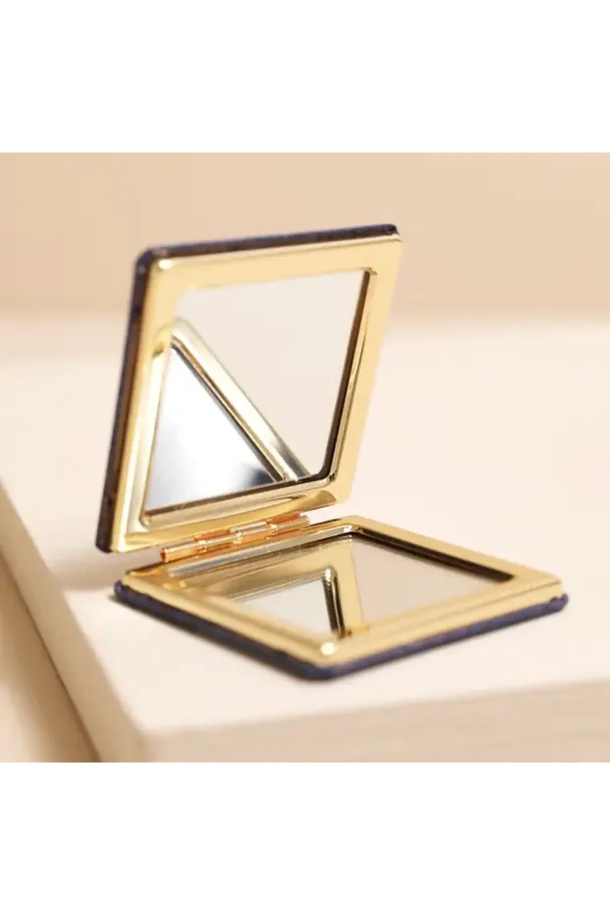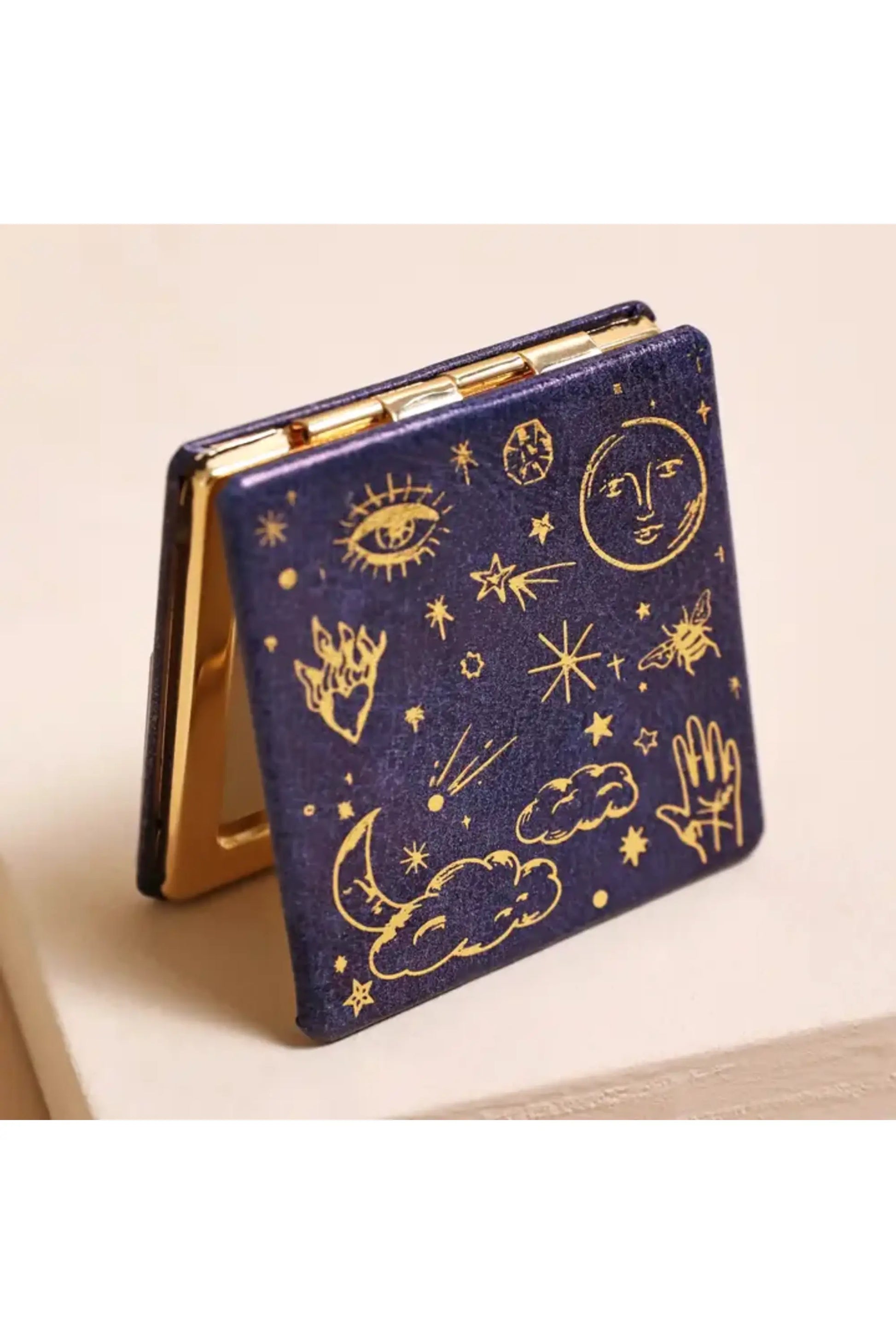 The surfaces of this sweet compact mirror are a deep blue, etched with gold celestial symbols. This cute compact would make a wonderful gift for a makeup lover or someone always busy and on the move.