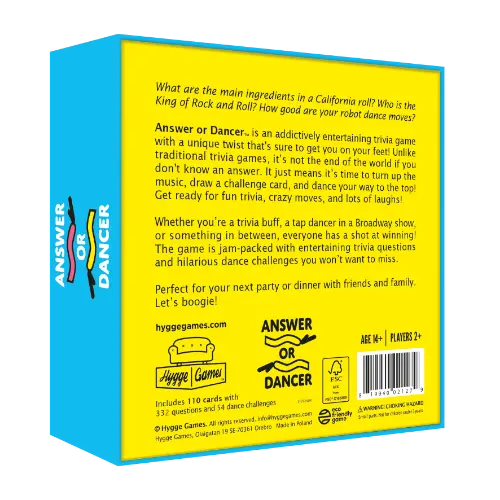 Answer or Dancer is an addictively entertaining trivia game with a unique twist that’s sure to get you on your feet! Unlike traditional trivia games, it’s not the end of the world if you don’t know an answer. It just means it’s time to turn up the music, draw a challenge card, and dance your way to the top! Get ready for fun trivia, crazy moves, and lots of laughs!