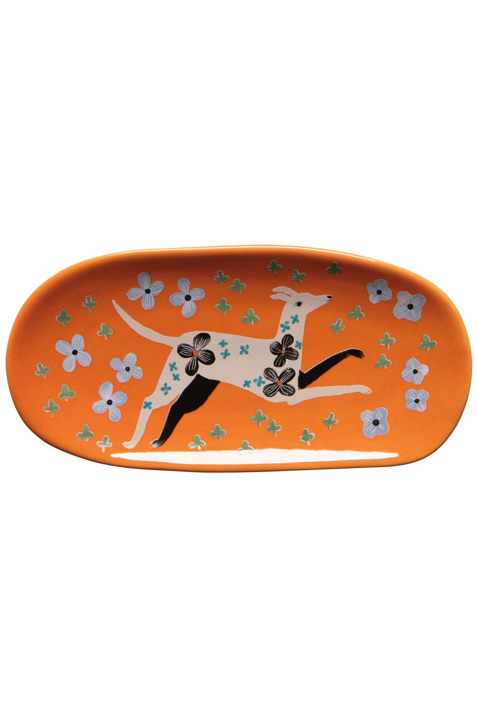 The ceramic Dogwood dish in its unique shape makes a convenient landing spot for keys, loose change, small jewelry, and paperclips. This design invites you to roam along the country road with a playful pup and a palette of rich rust, serene blue, and striking black conveying an unassuming beauty.