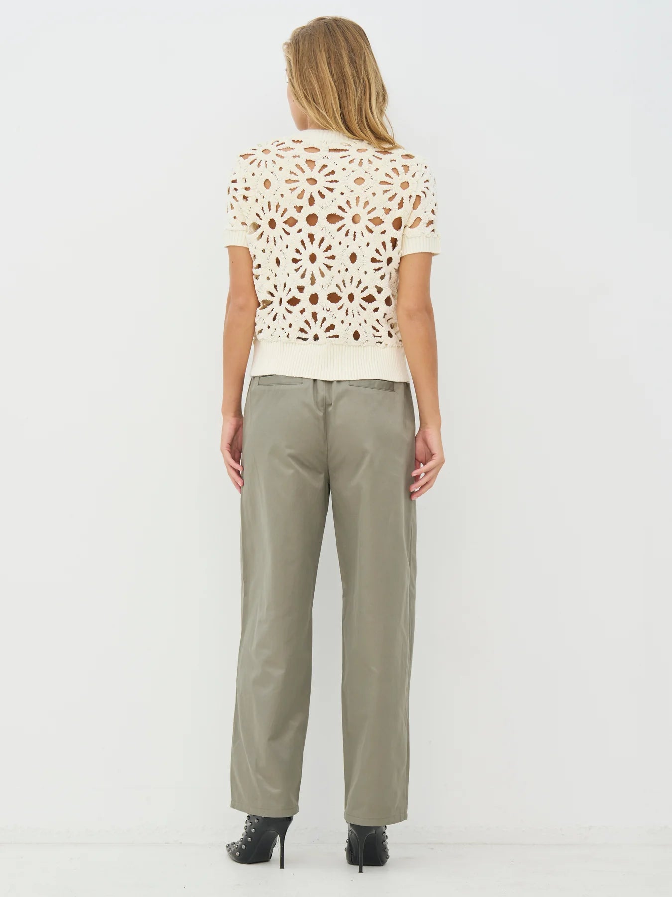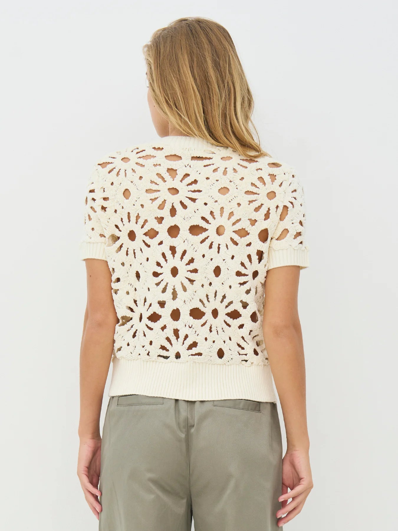 This short jacket/cardigan has a floral eyelet pattern that gives a light and decorative look. It closes with a full zip at the front and has short sleeves and a simple finish at the neck and bottom. The back follows the same pattern and gives a calm overall impression. Style it over a simple top or dress, or wear it with loose pants for a relaxed and versatile everyday look.