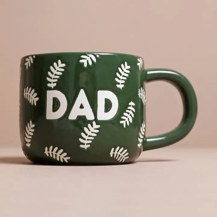 Made of ceramic with a shiny rich green glaze, this mug features a wax resist design to display a fern leaf pattern around the mug. T he name 'Dad' sits in the centre among the leaves, ensuring nobody else ever mistakenly sips from his own special cup. Dimensions width (incl. handle) 14cm x height 8cm x depth 9.9cm