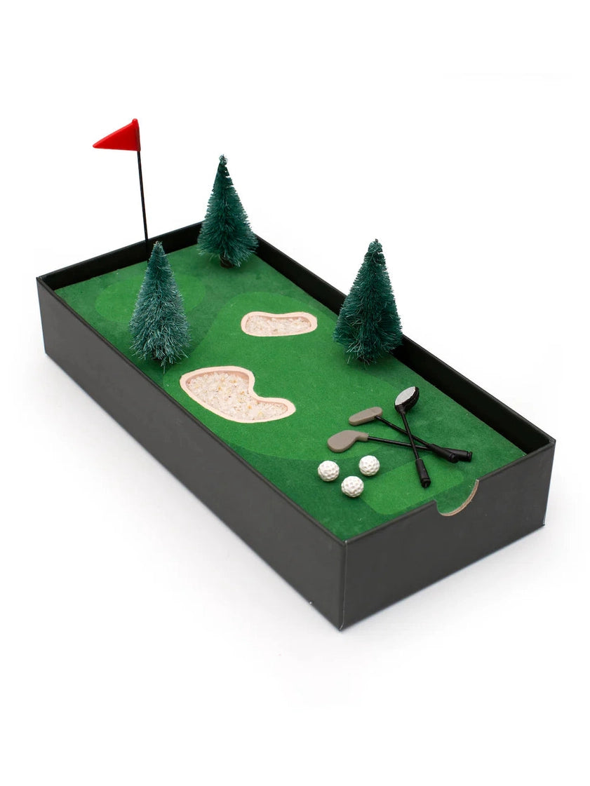 Includes three mini golf clubs and balls, three decorative trees, and quartz sand to fill your bunkers.