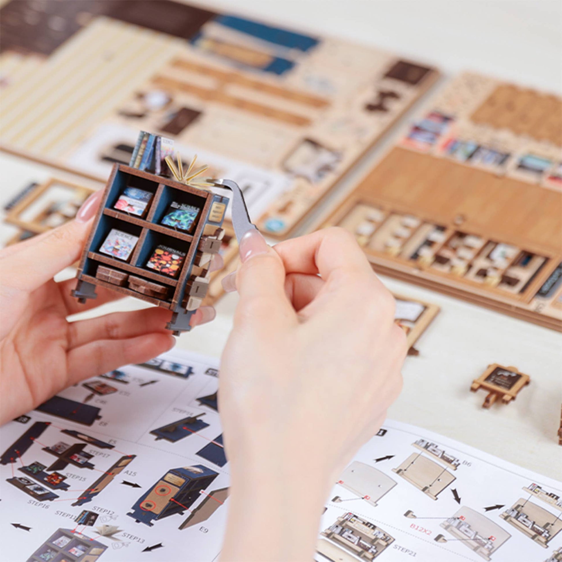 From the intricate woodwork of the storefront to the tiny posters, plants, and meticulously arranged reading materials inside, every piece invites you to slow down, take your time, and craft a scene that feels like a sanctuary for the soul. Whether you place it on your bookshelf or gift it to a fellow book lover, this book nook transforms any space into a story waiting to be told.