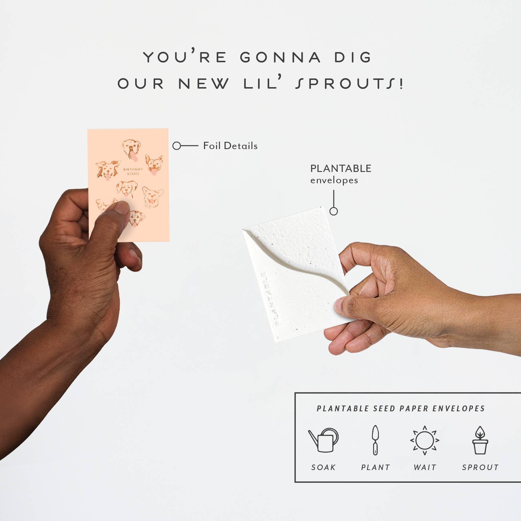 Meet the newest little SPROUT! Think all the goodness of our full size greeting card BUT at a petite "mini me" and super cute enclosure card size. All Seedlings sprouts have foil details and a PLANTABLE seed paper envelope which is embedded with wildflower seeds. This seed paper is made of a biodegradable eco-paper created with post-consumer materials - no trees harmed for this paper! When planted, our envelopes compost away leaving only flowers behind. Blank inside, our mini greeting cards are printed on premium paper and are all accented with foil details. Need a display? Order SPRDIS24 for a 24 pocket tabletop spinner. Card size: 2.5" x 3.5" All Seedlings cards are made in the U.S.A.