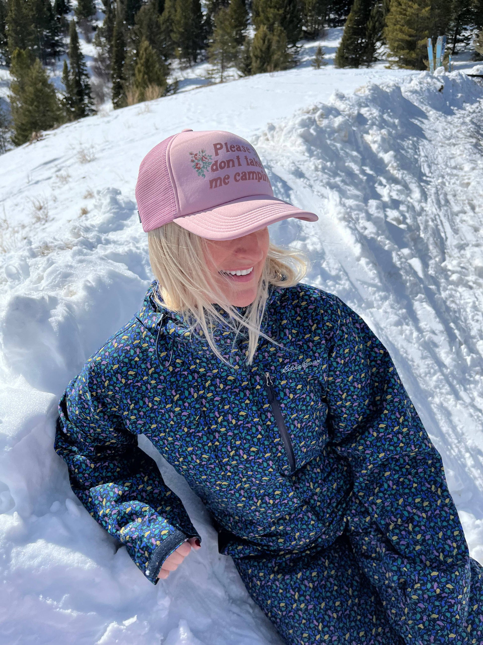 The perfect hat for the indoorsy type. Super cute funny hat that says I'd rather not sleep in a bag with a rock digging into my back. Fun retro style font with flowers for a fun summer look!