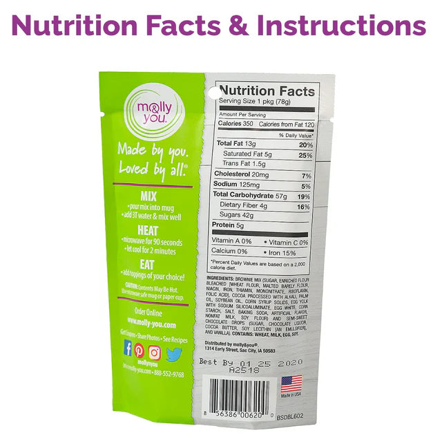 Dive into chocolate heaven with molly&you Double Chocolate Chip Brownie Mug Cake! This treat is pure indulgence, loaded with rich chocolate chunks swirled into a decadent fudge brownie. Just add water, stir, and microwave for a warm, gooey dessert ready in minutes. Perfect for any chocoholic craving!