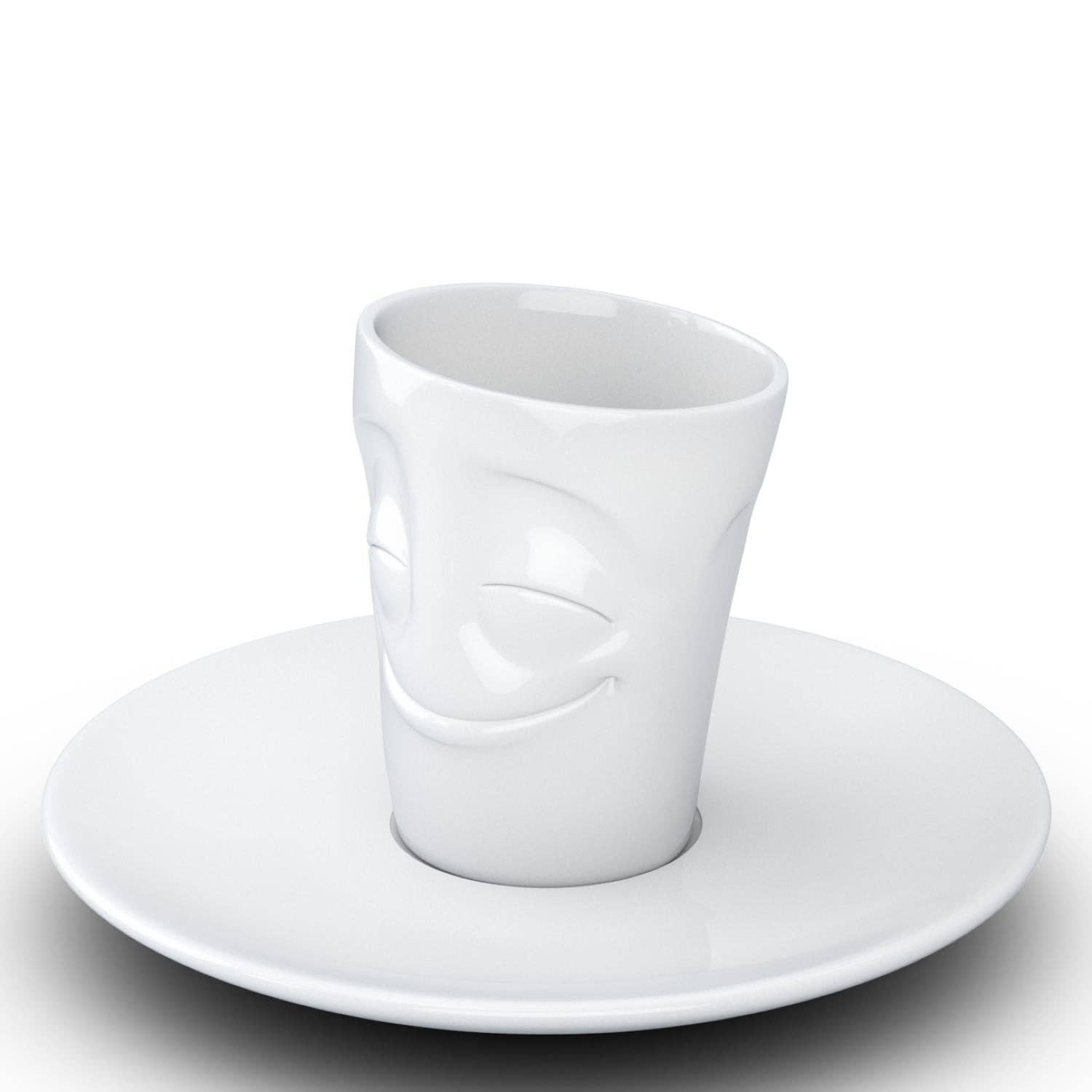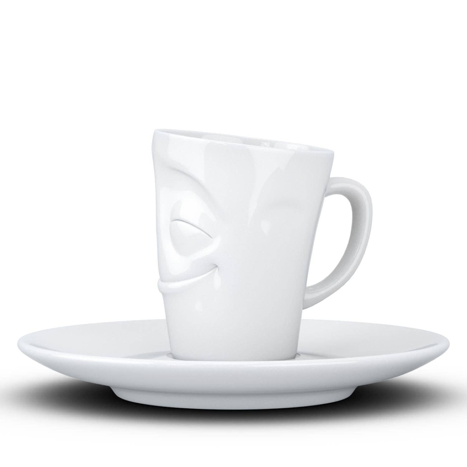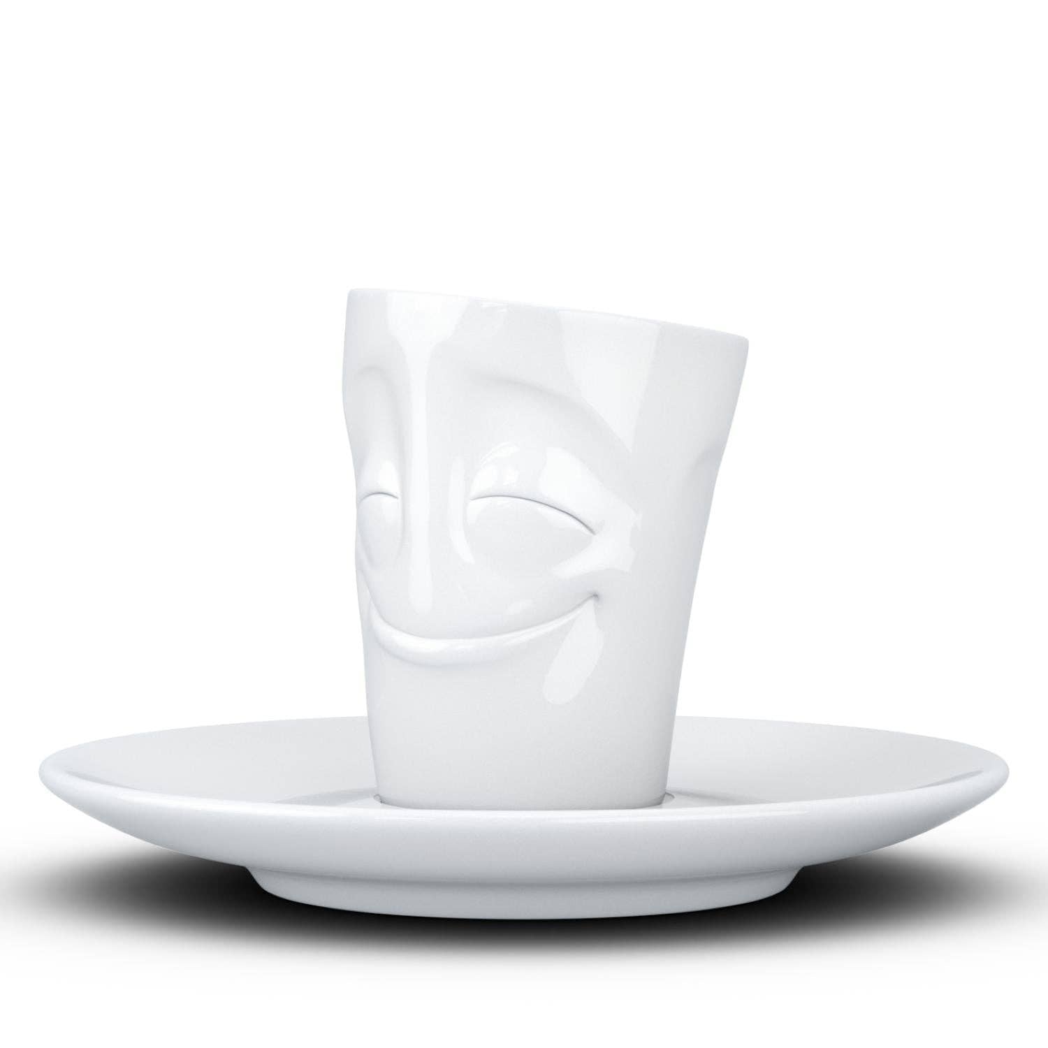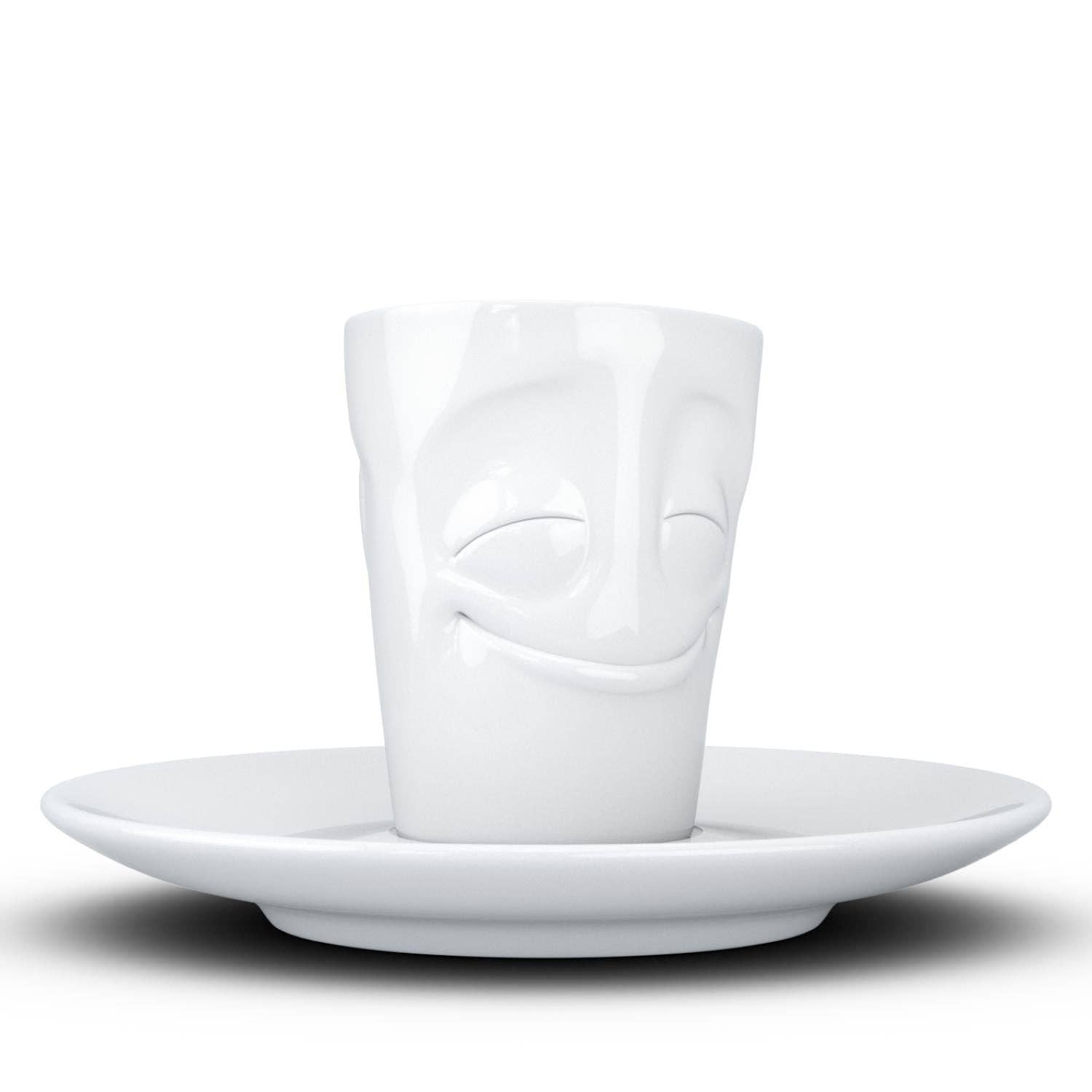 This amazing espresso mug with a 'cheery' facial expression and 2.7 oz capacity will start your day on a high note. Premium porcelain espresso cup in a tall 'mug' design with saucer in white. From the TASSEN product family of fun dishware by FIFTYEIGHT Products.