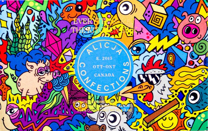 Everything But The Kitchen Sink is a 30.4% caramelized milk chocolate bar. Everything you could think of putting in a chocolate bar is here: chips, pretzels, popcorn, candies, gummies, dried fruit, nuts, caramel, sprinkles, the list goes on!
