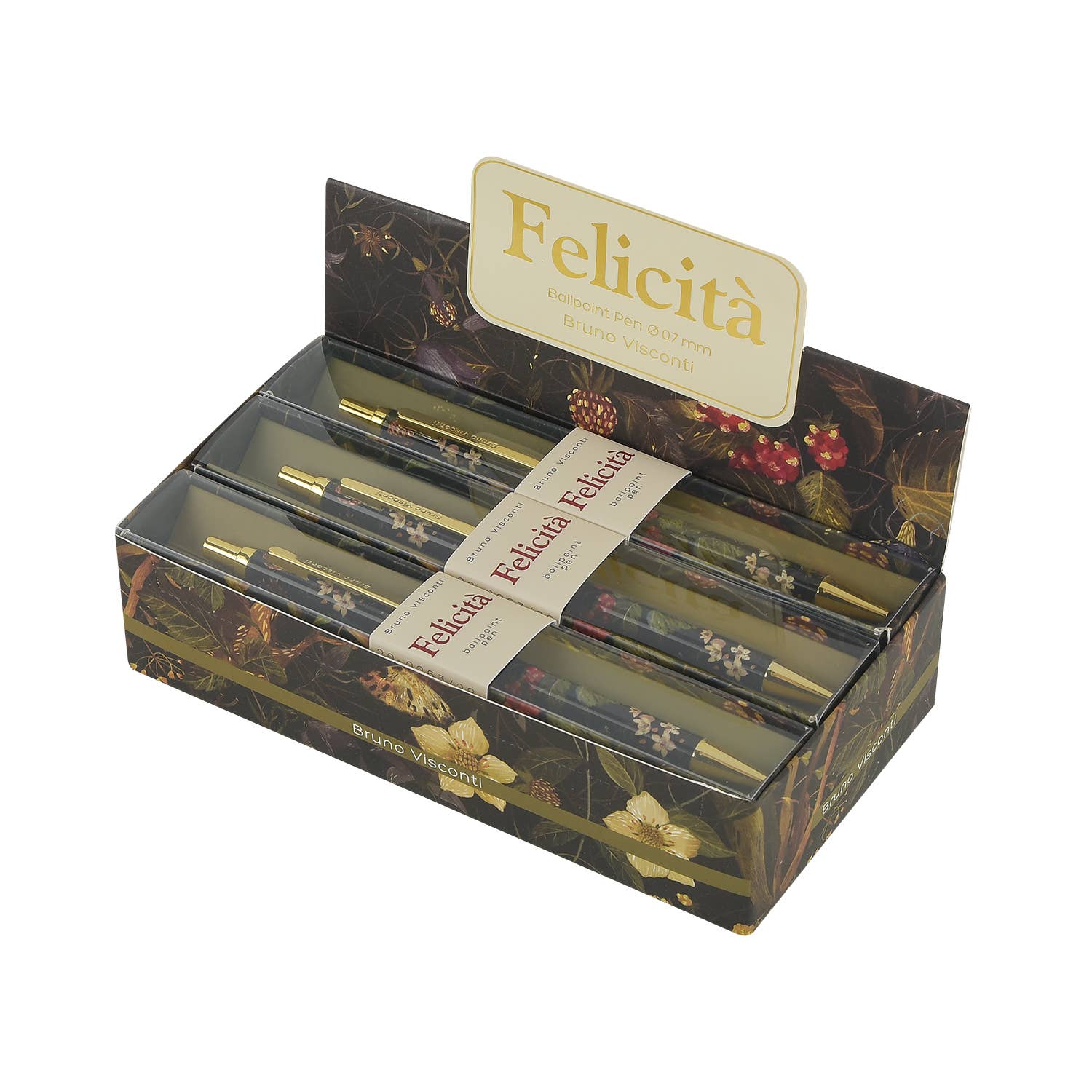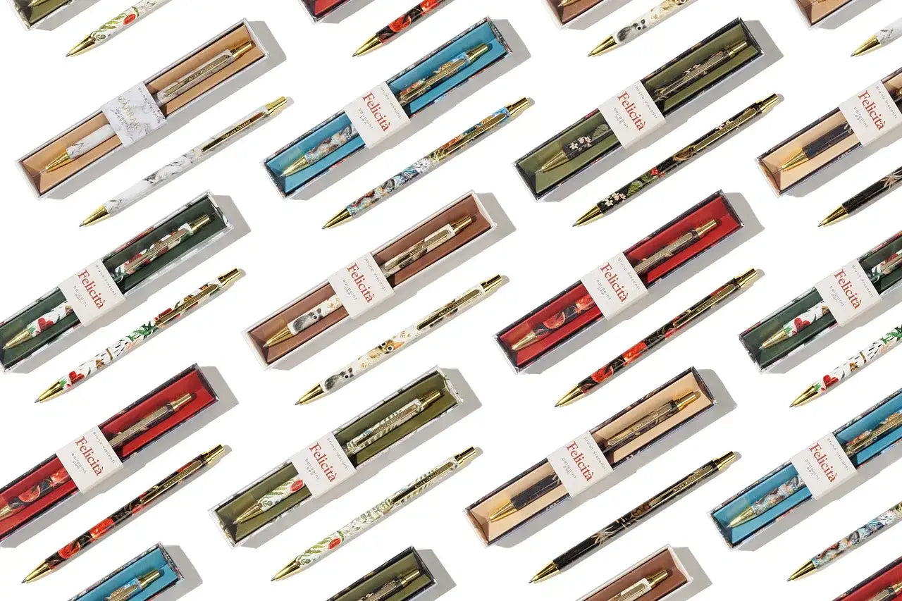 Our new Felicita Pens feature our beautiful illustrations of our most popular Flora Designs on a steel barrel with a .7mm ball point tip and black ink. Each Felicita Pen comes in a coordinating individual gift box and in a CDU of 6 pieces