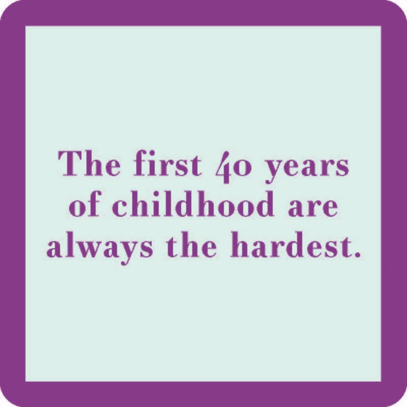“first 40 years” Coasters are 4”x 4” resin with cork backing and round corners. Made in the USA.