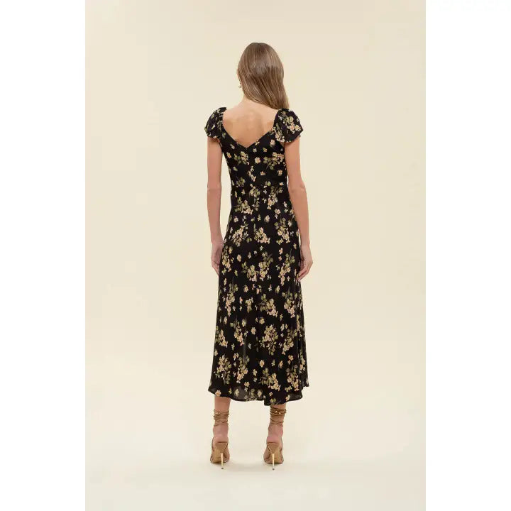 Floral V Neck Ruffle Sleeve Side Slit Midi Dress