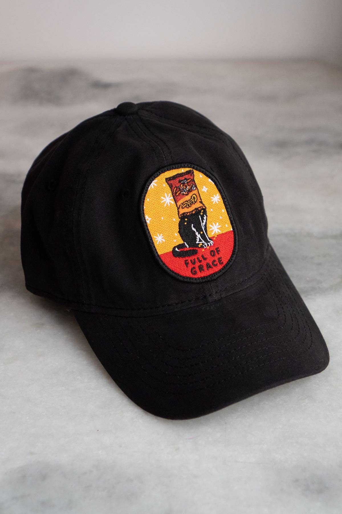 Just a very relatable cat stuck in a bag of cheetos they were guzzling. Hey! We finally sewed some of our favourite patches to our favourite hats. Embroidered patch sewn onto a 6 panel unstructured baseball hat (AKA "dad hat"). Adjustable strap back with metal clasp.