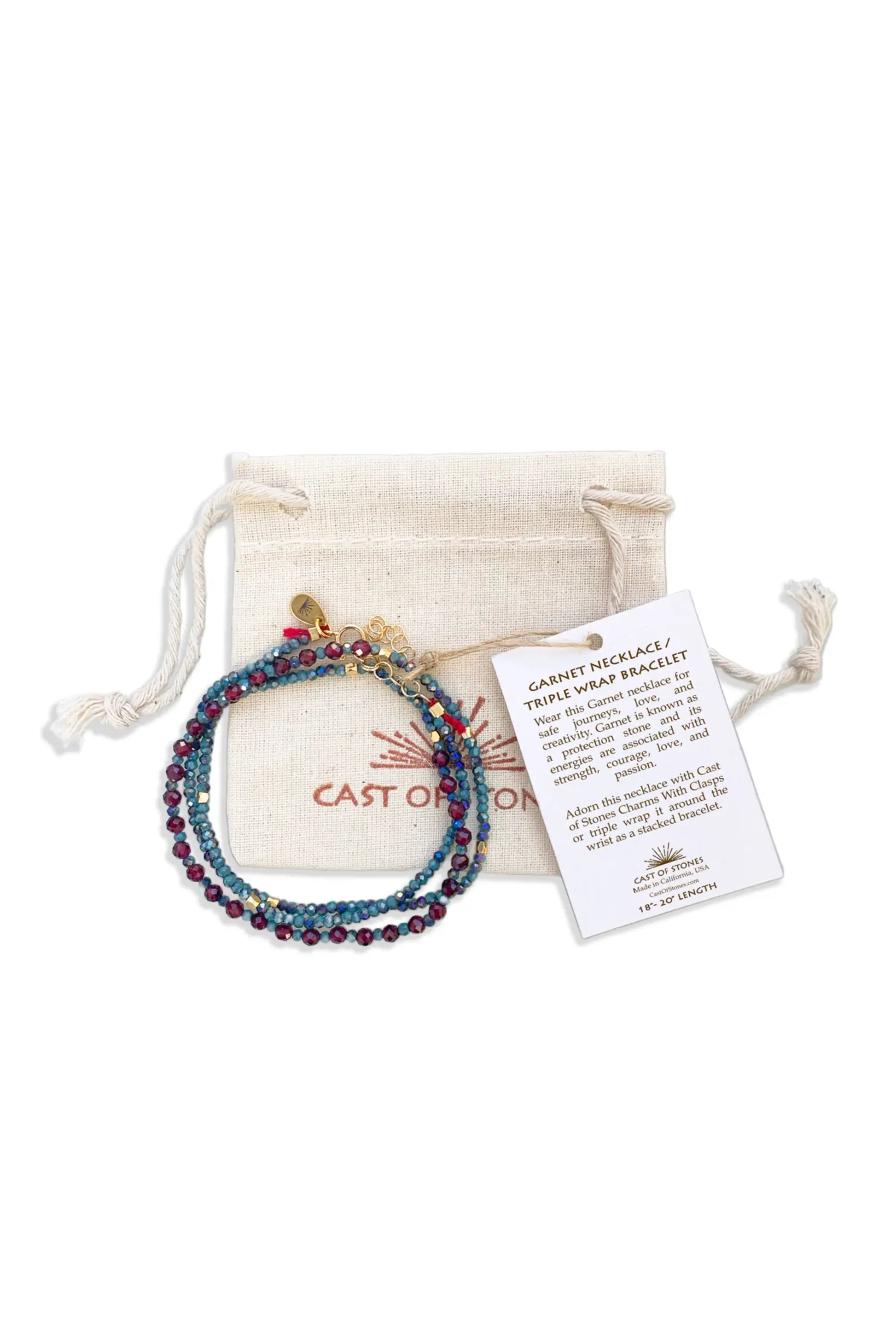 Gemstone Necklace/Triple Wrap Bracelet, made with natural faceted gemstones and handcrafted in Los Angeles. Wear it as a necklace or a triple-wrap bracelet. Each piece comes with a information card with the meaning of the gemstone and an organic cotton pouch for storage.