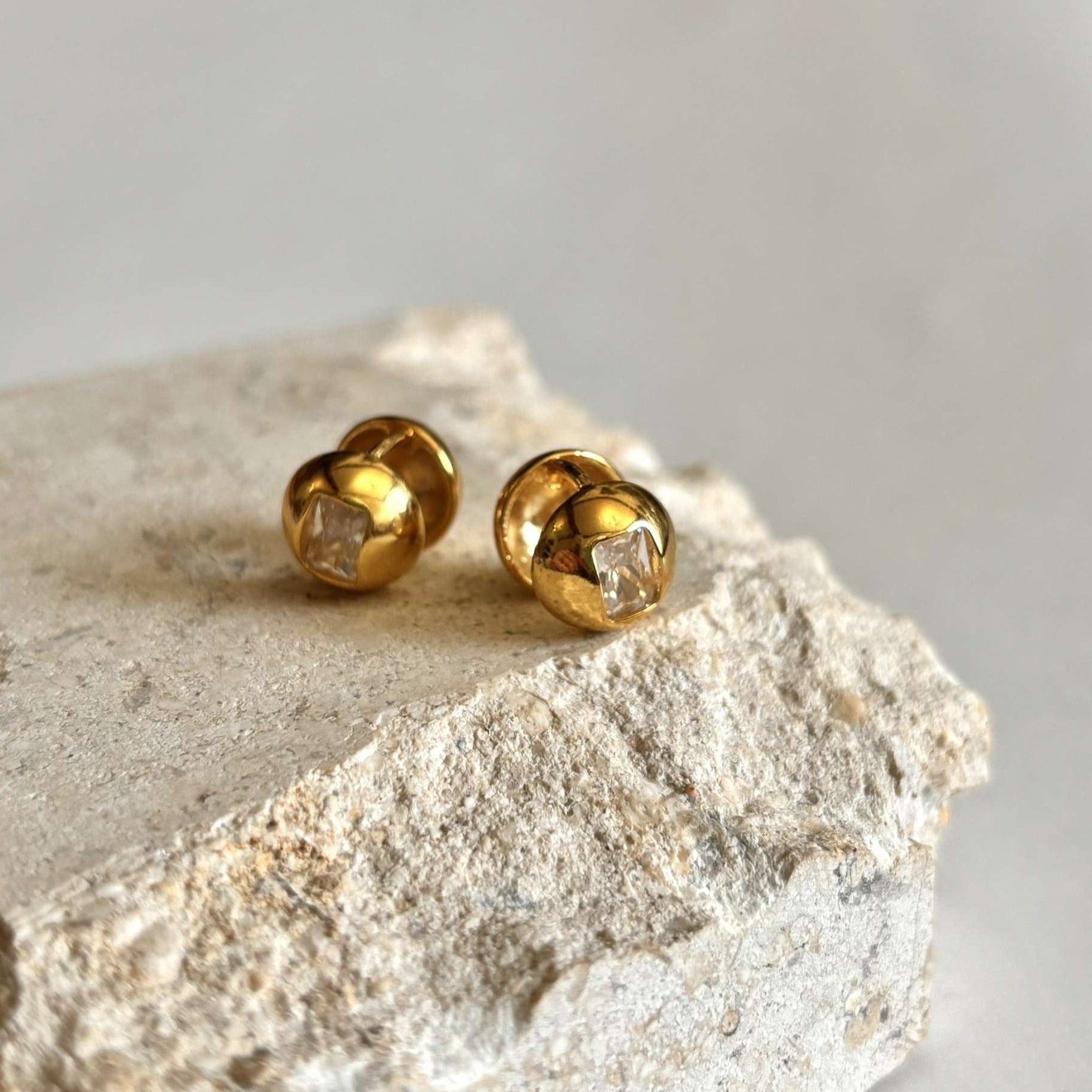 Add some whimsy to your outfit with the Maru Earrings! These chunky gold earrings feature sparkling clear gems, making them the perfect playful addition to any look. Don't just wear jewelry, make a statement with the Maru Earrings.