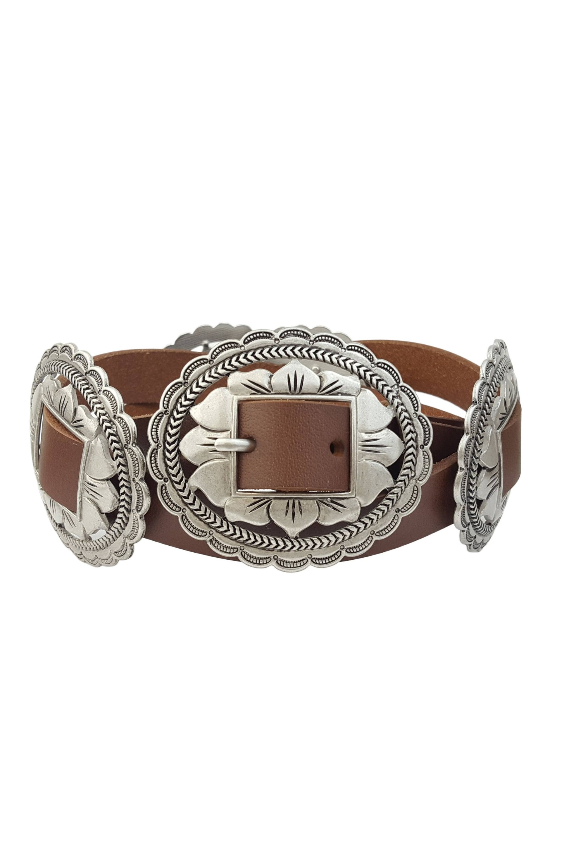 Genuine Brown Leather w. Western Oval Floral Concho Belt