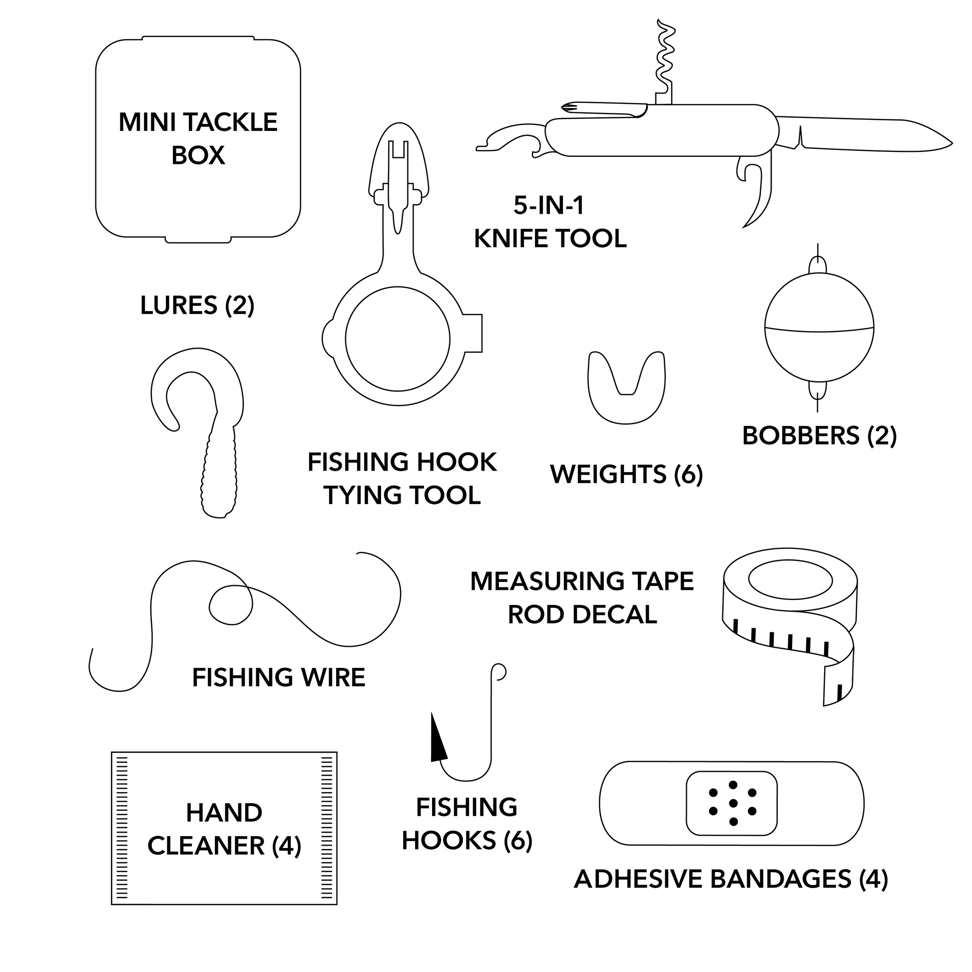 Reel them in with our "Great Catch" Fishing Kit. The lagoon blue vegan leather pouch contains 11 essentials for fishing hobbyists, including hand cleaning towelettes, adhesive bandages, measuring tape decal, fishing hook tying tool, and a tiny tackle box with fishing hooks, fishing wire, purse, weights, and bobbers. Ideal for Father's Day and summer activity displays. Part of our new Adventure Collection, with hiking, camping, and golf options.