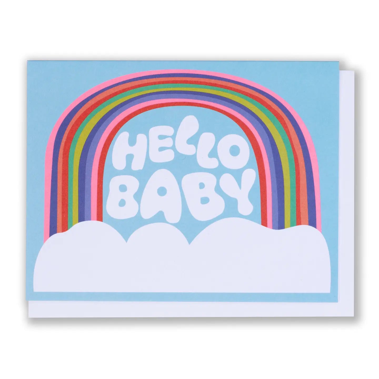 Hello Baby in tiny puffy cloud shaped letters under an arching rainbow in typical not quite traditional Banquet Workshop colors.