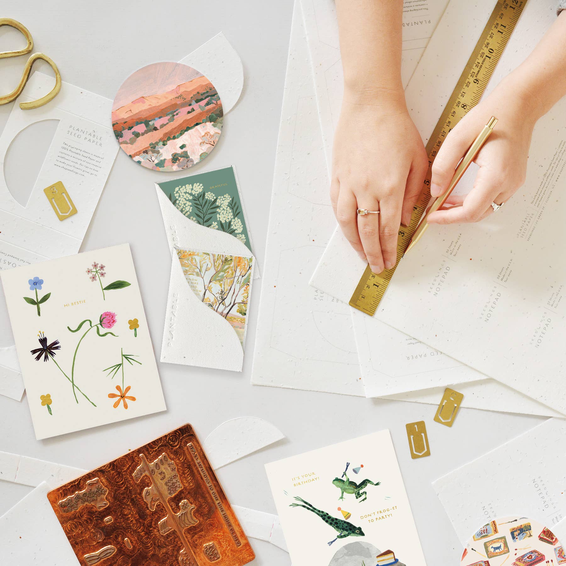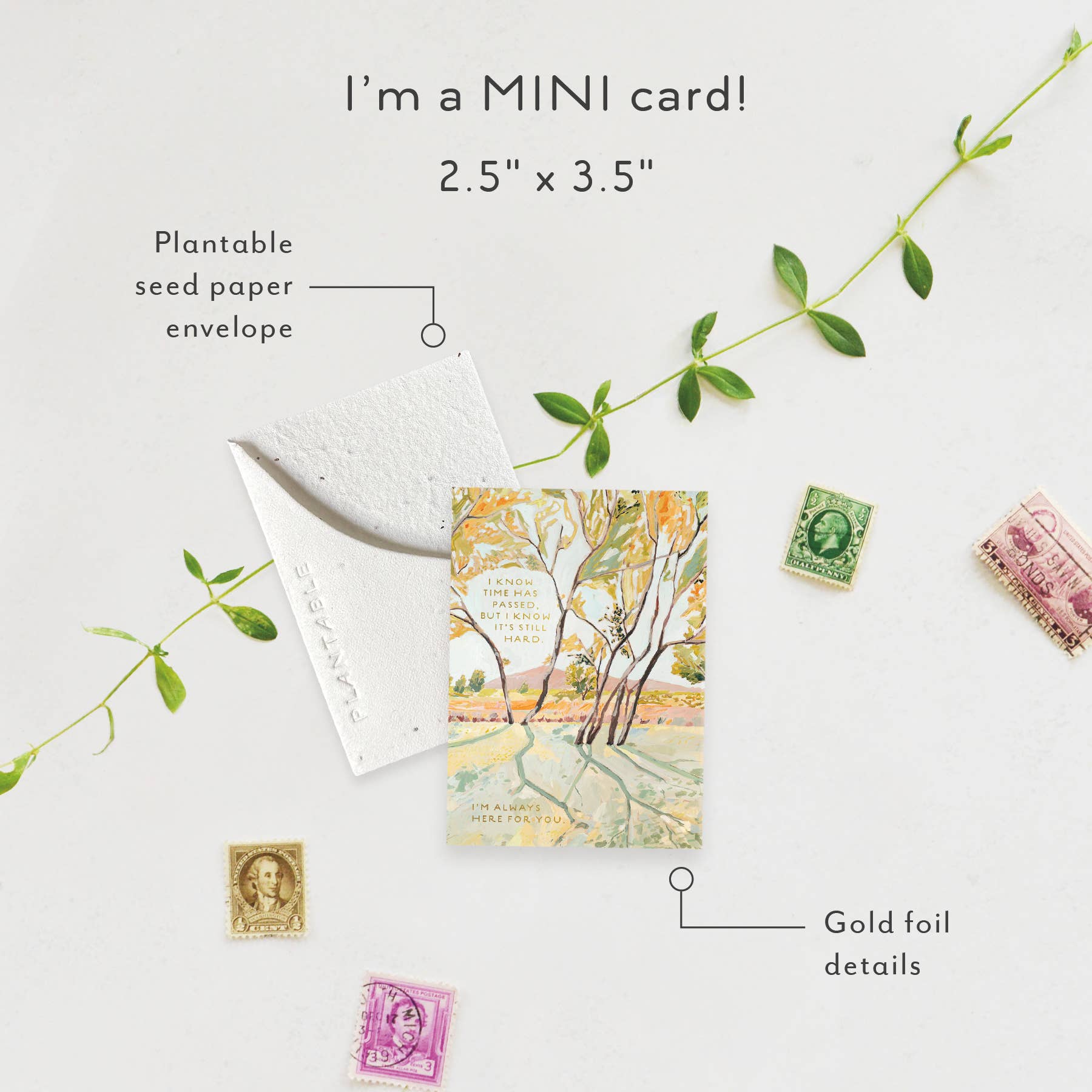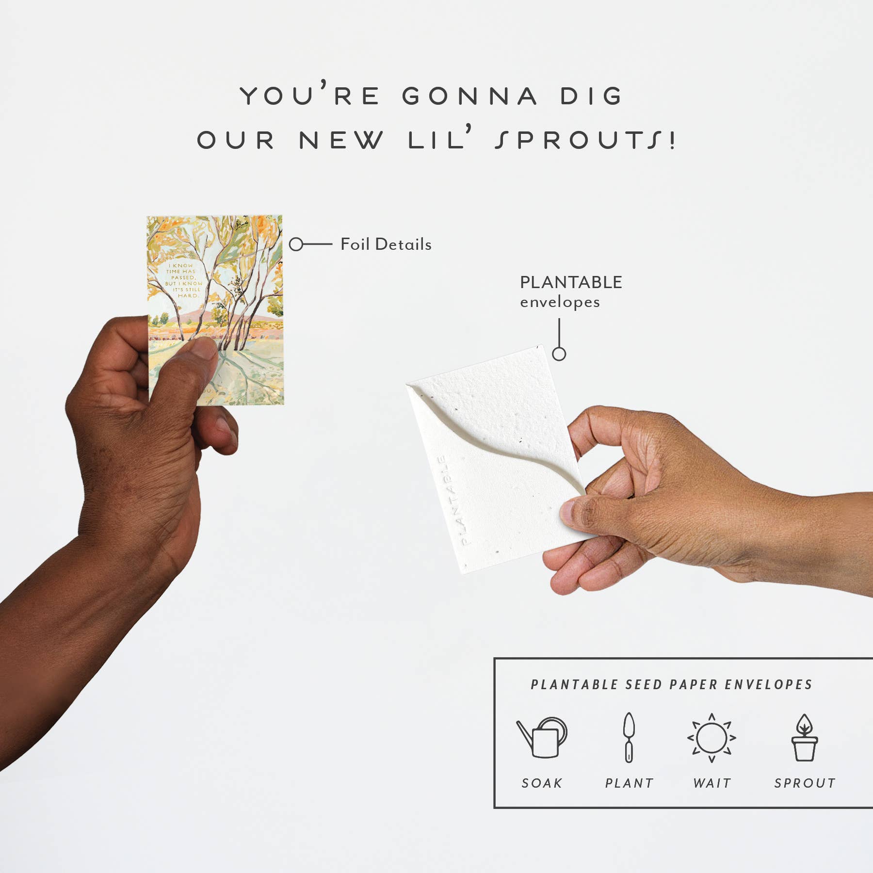 Meet the newest little SPROUT! Think all the goodness of our full size greeting card BUT at a petite "mini me" and super cute enclosure card size. All Seedlings sprouts have foil details and a PLANTABLE seed paper envelope which is embedded with wildflower seeds. This seed paper is made of a biodegradable eco-paper created with post-consumer materials - no trees harmed for this paper! When planted, our envelopes compost away leaving only flowers behind. Blank inside, our mini greeting cards are printed on premium paper and are all accented with foil details. Need a display? Order SPRDIS24 for a 24 pocket tabletop spinner. Card size: 2.5" x 3.5" All Seedlings cards are made in the U.S.A.