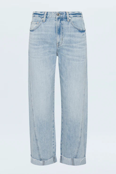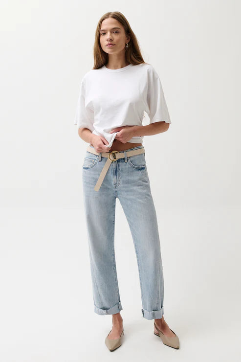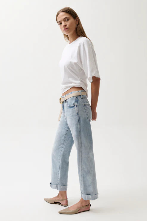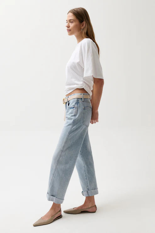 Your new go-to for effortless style. Kacey sits as a comfortable mid rise with an easy boyfriend fit and relaxed silhouette, finished with a 26 1/2" inseam. The stylish cuffed hem adds intentional finishing while thoughtful seaming details subtly elongate in Berkeley, a light wash that feels lived-in and loved. Crafted from rigid denim, this style will naturally soften and relax with wear.