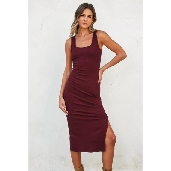 Effortless elegance meets modern edge in this sleeveless ribbed knit midi dress. The structured square neckline frames your shoulders beautifully, while the figure-hugging silhouette skims your curves in all the right ways. A cheeky left side slit adds movement and attitude without compromising sophistication. Unlined for a lightweight feel, this versatile piece transitions seamlessly from office to evening. The premium blend of polyester, rayon, and spandex ensures a comfortable stretch that moves with you. Perfect for anyone who believes less fuss means more style.