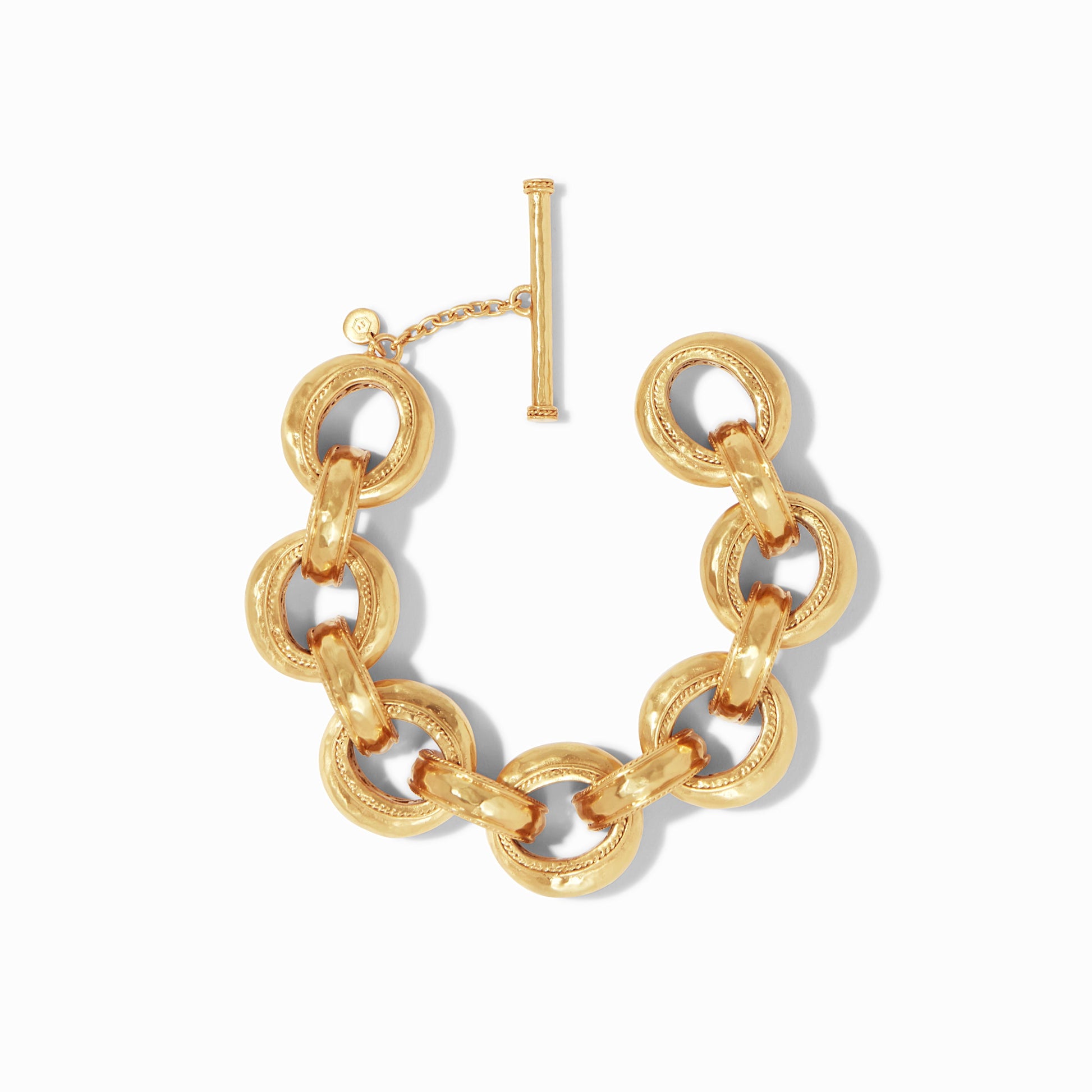 An elegant bracelet of lightly hammered golden links featuring a splendid pierced design on the inside and finished with a toggle.
