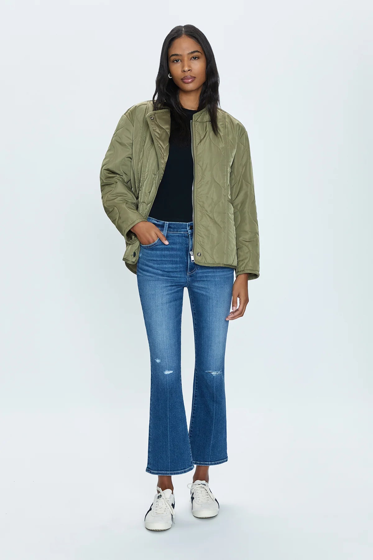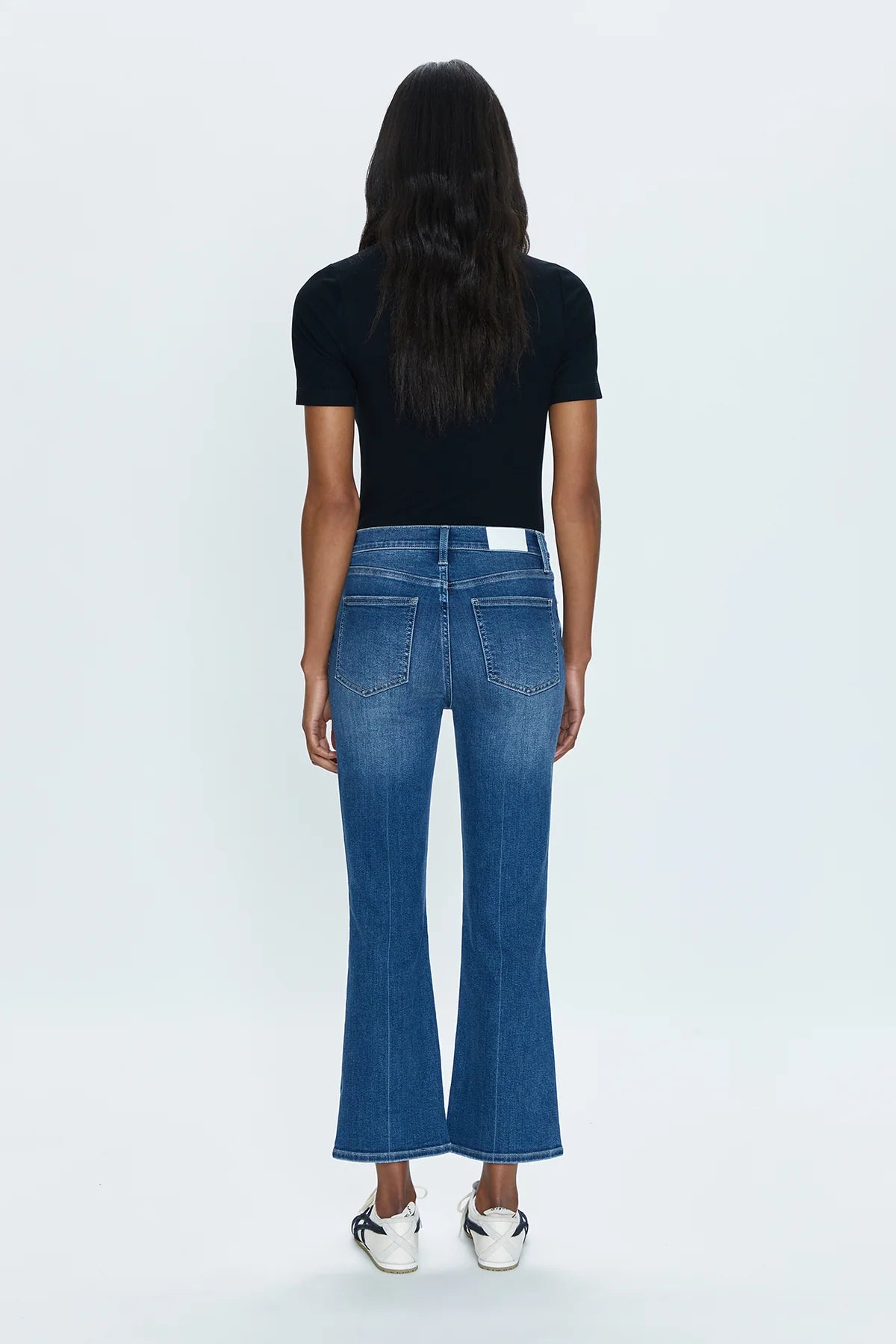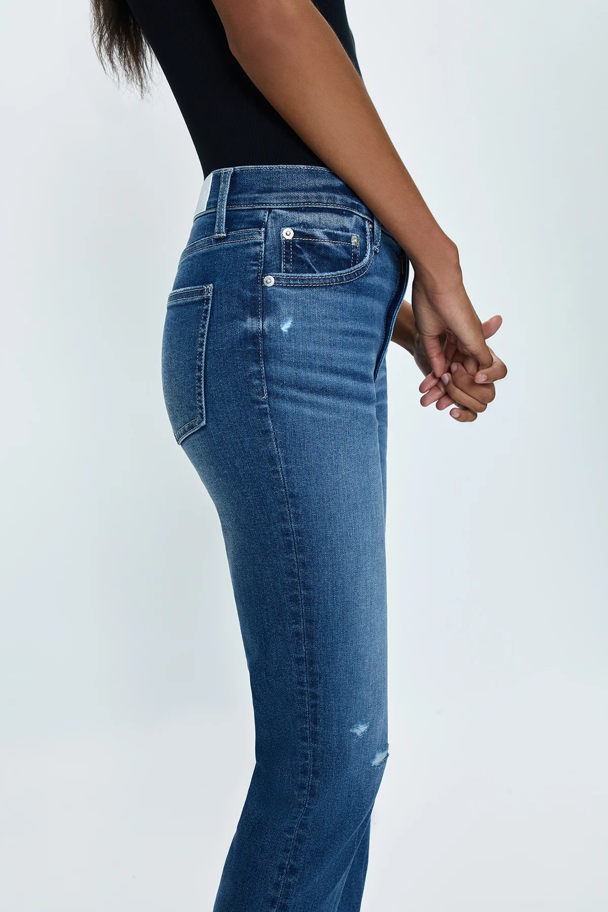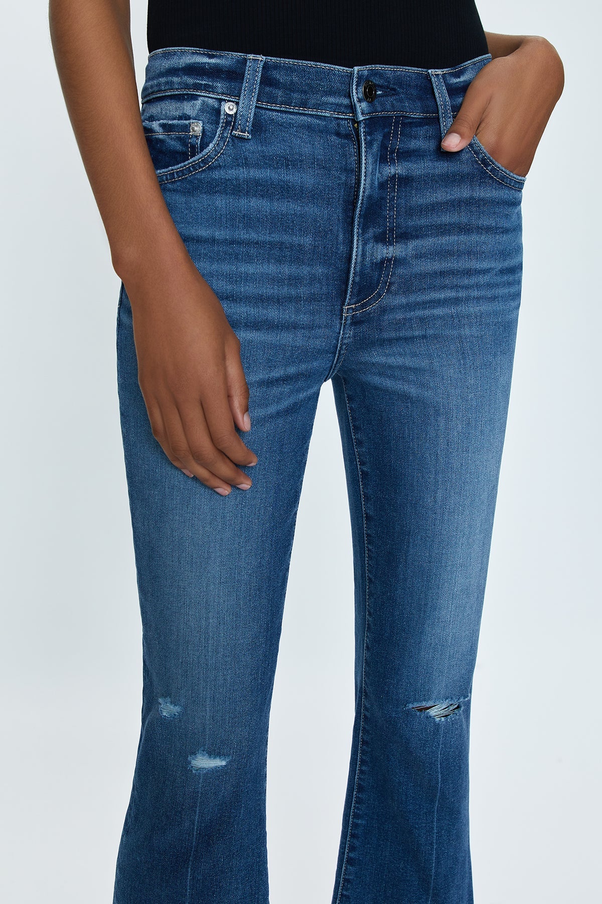 Bright lights in the big city. Our best selling bootcut silhouette with a high rise wait and cropped ankle hem, crafted from our super stretch denim. City Distressed is a deep blue denim wash with moderate fading and laser whiskering, and subtle hints of vintage distressing at the knees.