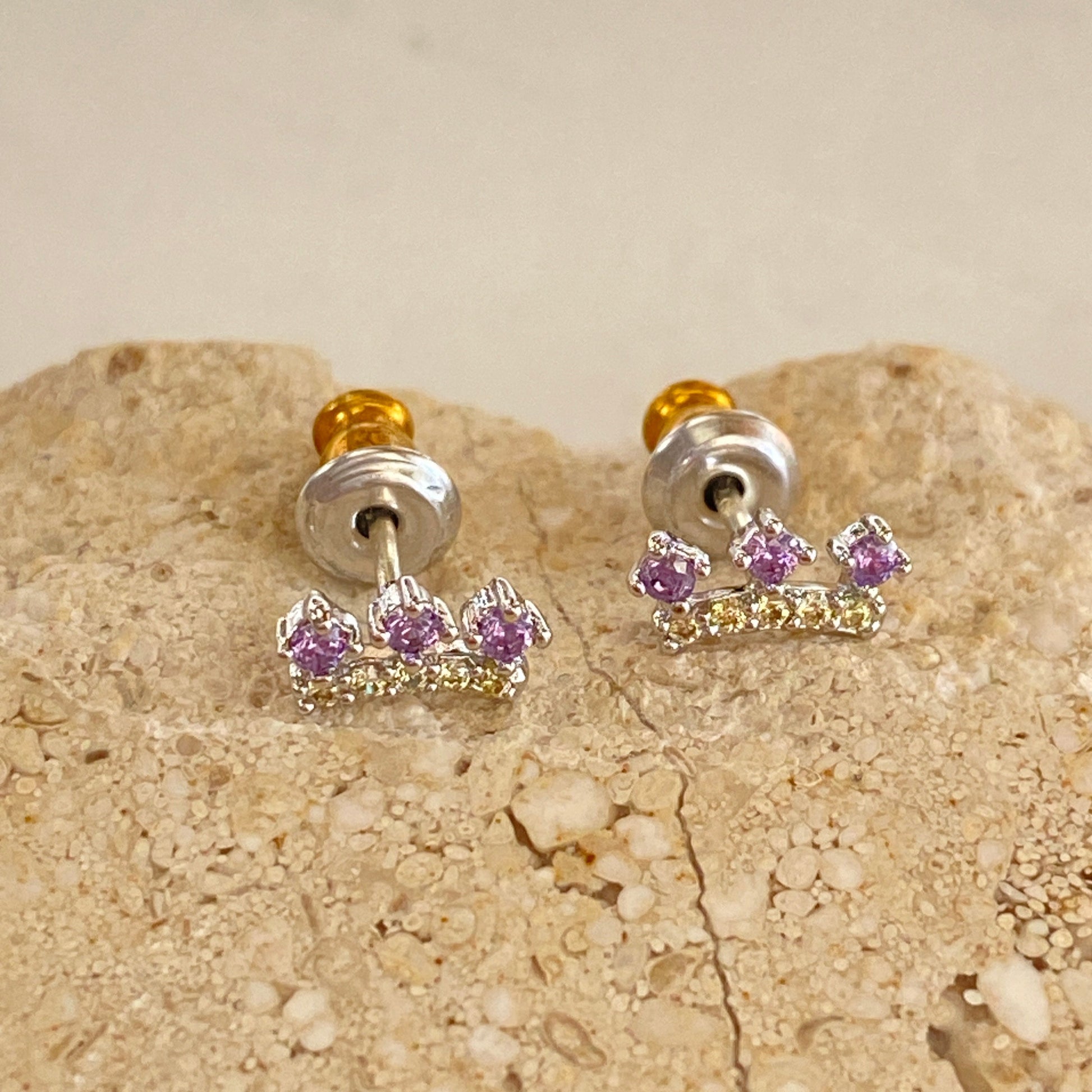 Experience the beauty of the Little Crown Stud Earring, a stunning 8mm long piece crafted with precision. Hand-set with a dazzling purple stone, add a touch of sophistication to your look with this dainty and stylish accessory.