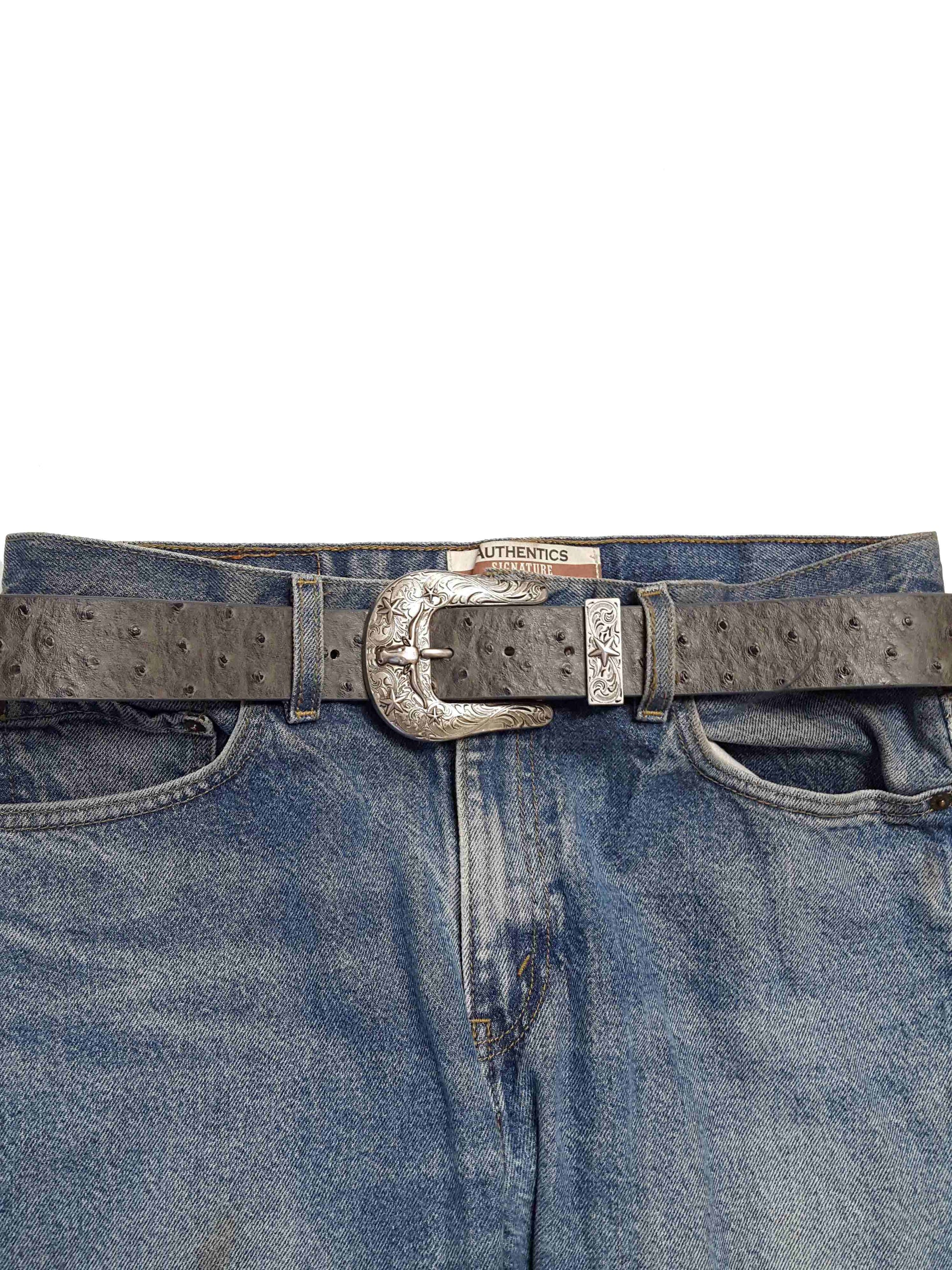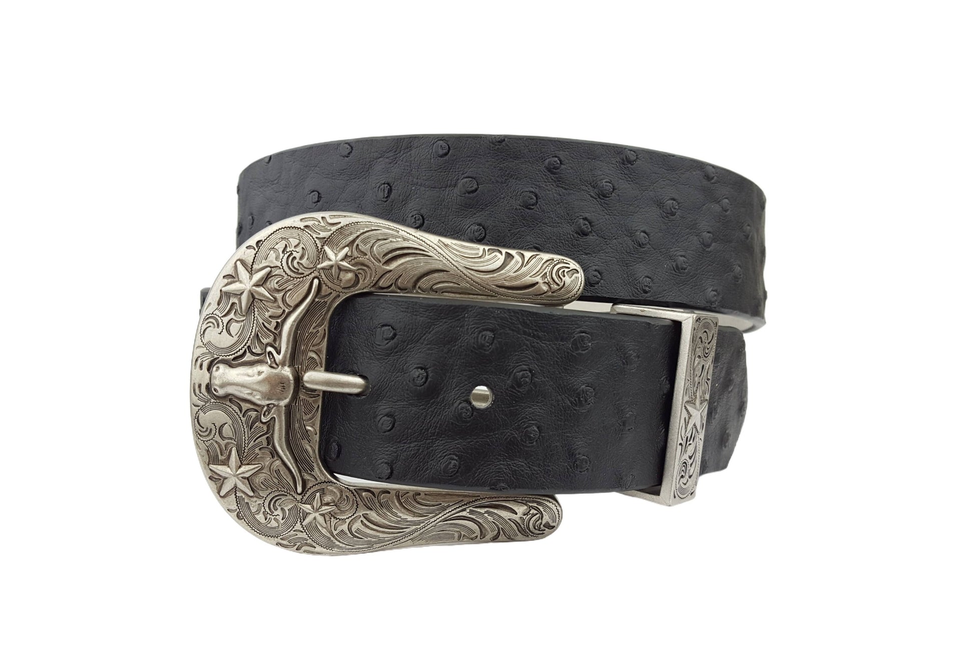 Western Style Buckle and matching loop with details of Longhorn and Texas Star In an antique silver metal plating finish Ostrich Printed on leatherette w. real leather lining. Fits perfect for jeans.
