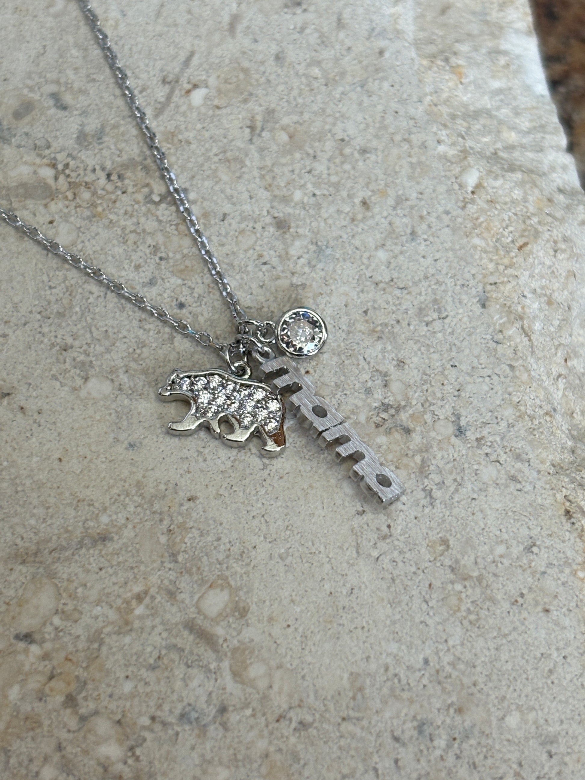 This Mama Bear Necklace features a mother bear with a "mama" charm. Perfect for any mama bear out there, this necklace symbolizes the strength and love of a mother. Add a playful touch to your outfit with this charming necklace.