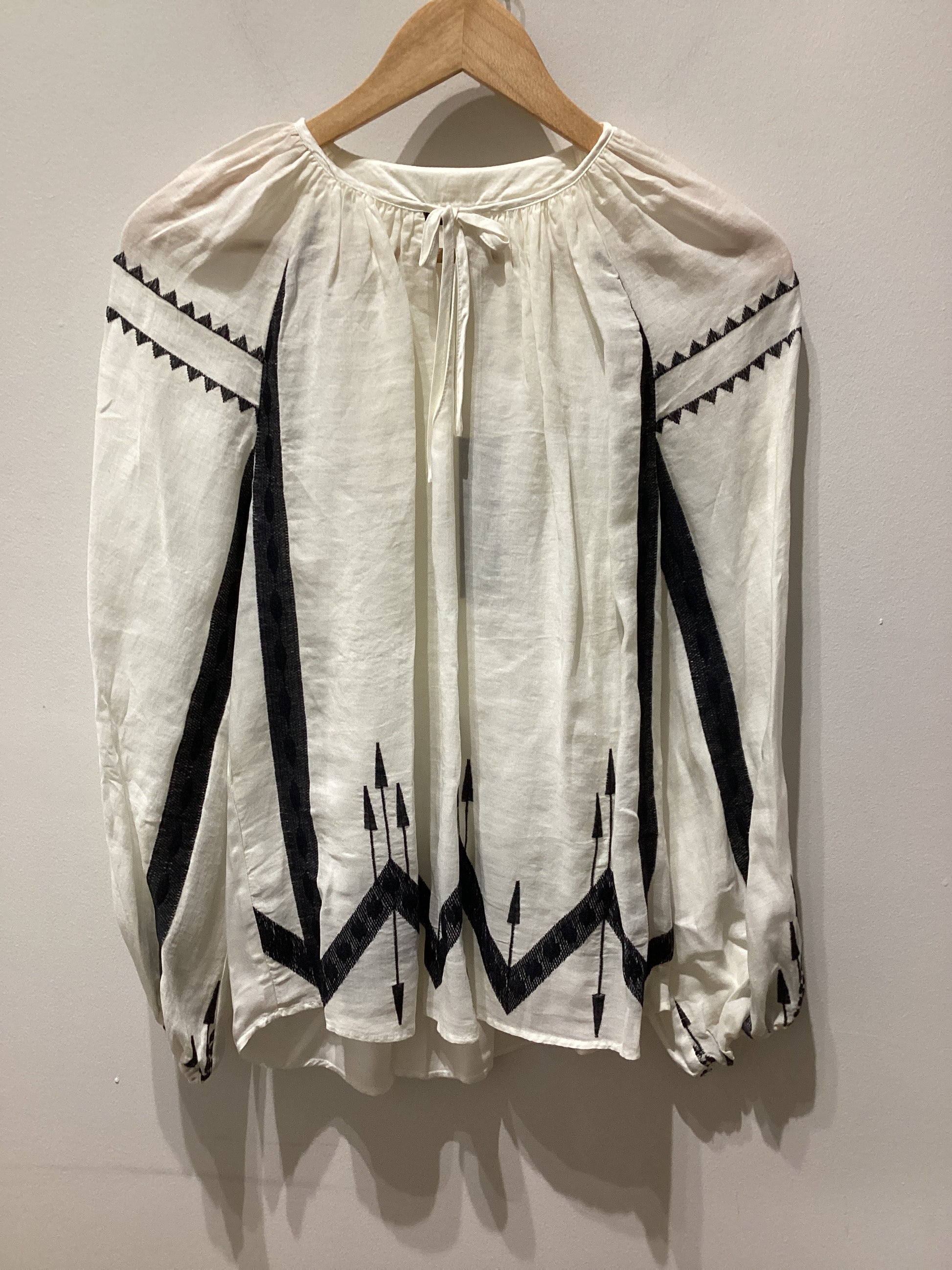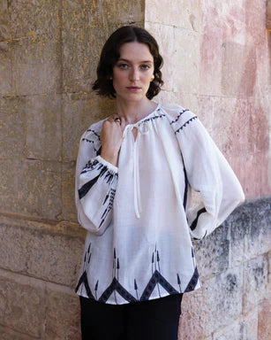Introducing the Milla Natural/Black Blouse - a luxurious blend of earthy tones and bold contrast. This blouse exudes sophistication and exclusivity, with its intricate design and high-quality materials. Elevate your wardrobe with this timeless piece.