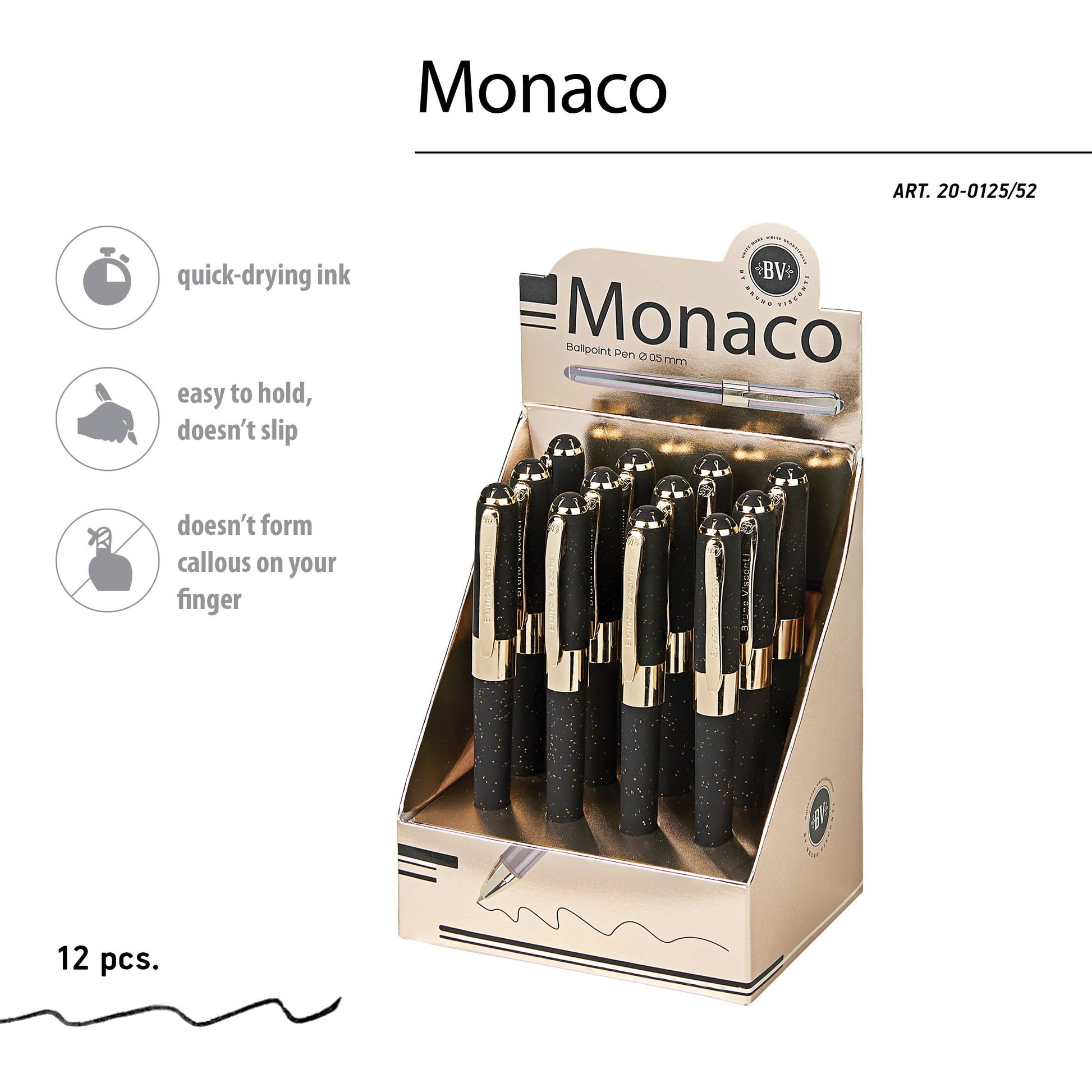 Monaco collection ballpoint pen series features: black ink, fine point, soft touch, 0.5mm.