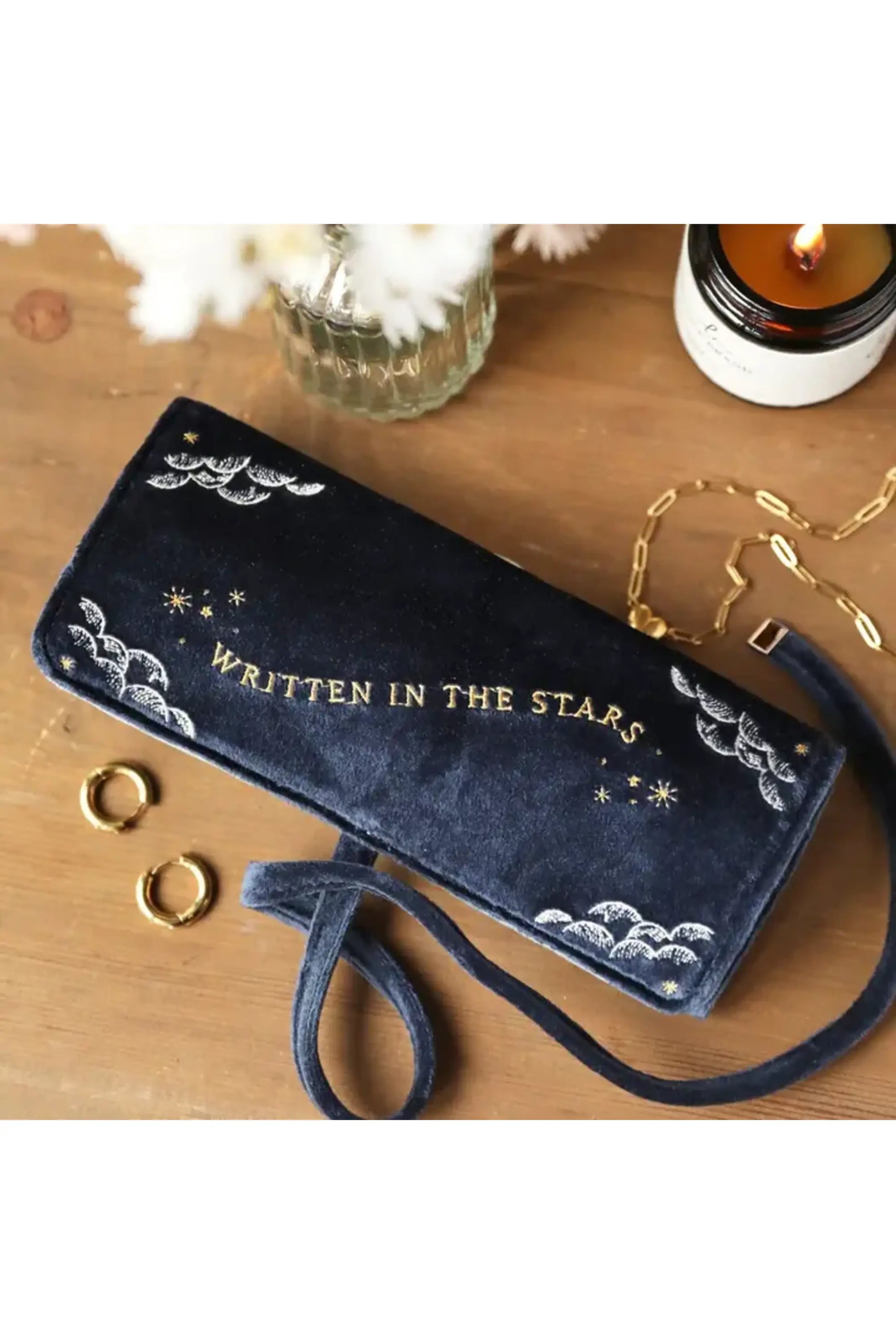 An elegant navy jewellery roll with gold stars With a zipped pocket and necklace hoops Including earring holes for tangle-free storage An elegant navy jewellery roll with gold stars With a zipped pocket and necklace hoops Including earring holes for tangle-free storage