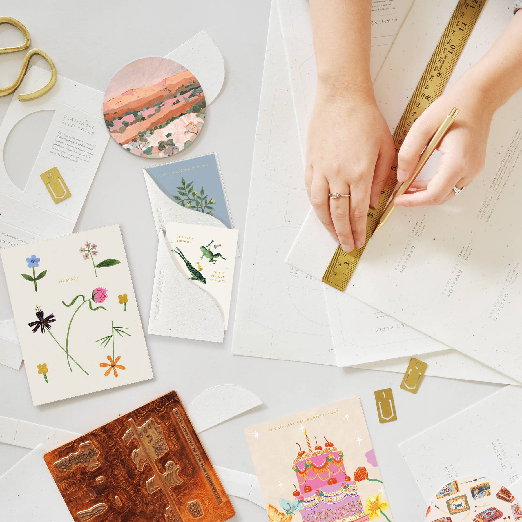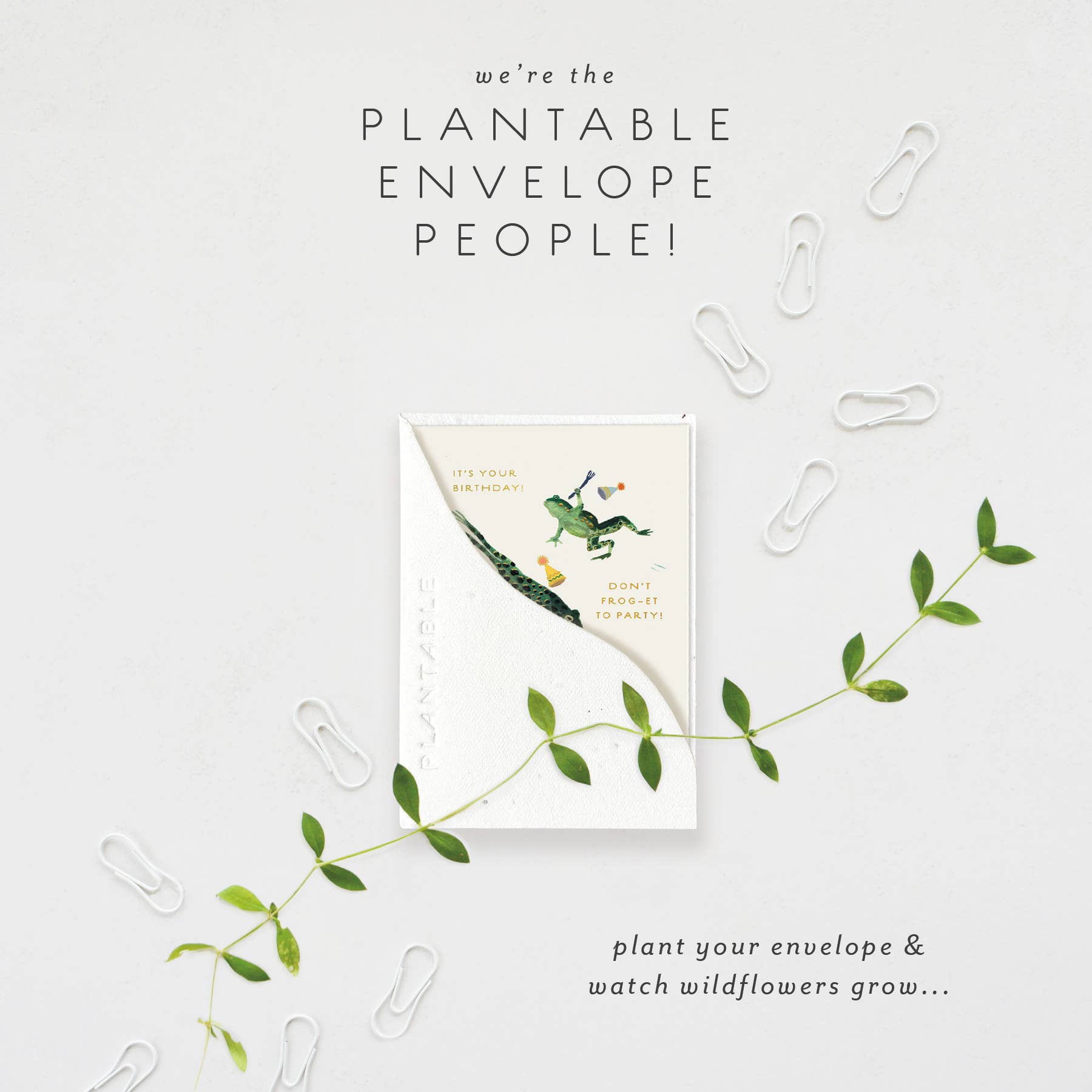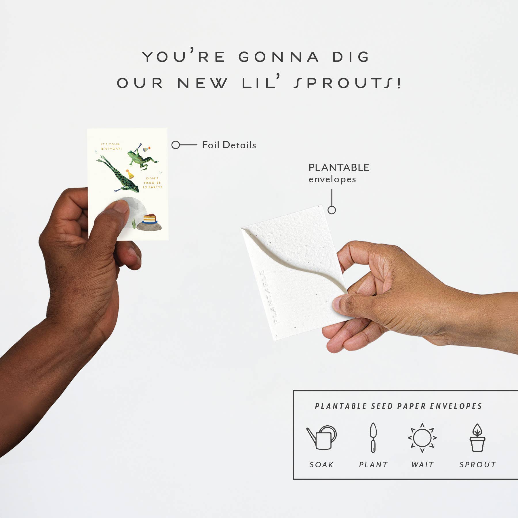 Meet the newest little SPROUT! Think all the goodness of our full size greeting card BUT at a petite "mini me" and super cute enclosure card size. All Seedlings sprouts have foil details and a PLANTABLE seed paper envelope which is embedded with wildflower seeds. This seed paper is made of a biodegradable eco-paper created with post-consumer materials - no trees harmed for this paper! When planted, our envelopes compost away leaving only flowers behind. Blank inside, our mini greeting cards are printed on premium paper and are all accented with foil details. Need a display? Order SPRDIS24 for a 24 pocket tabletop spinner. Card size: 2.5" x 3.5" All Seedlings cards are made in the U.S.A.