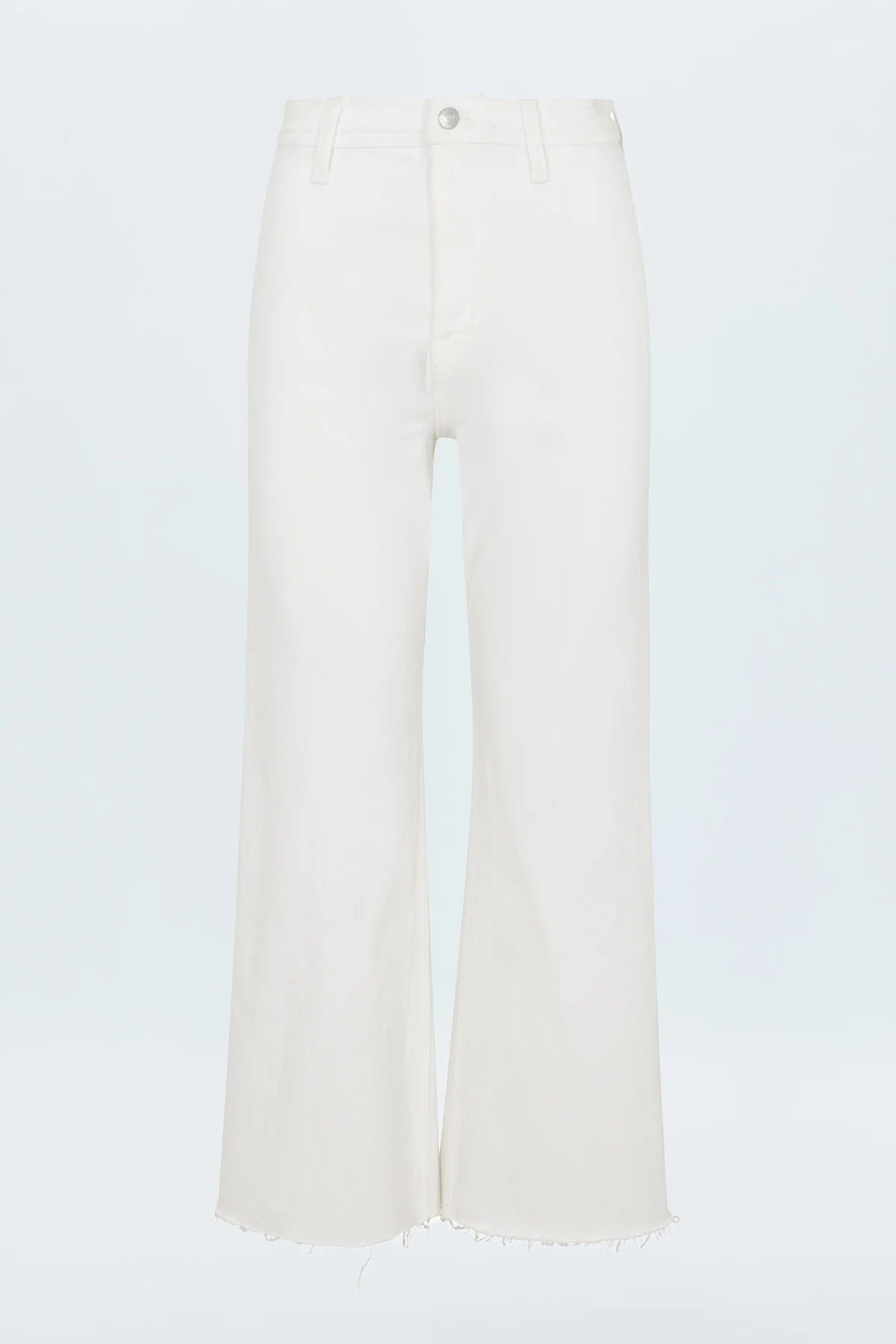 High rise waist, with a wide leg silhouette and a cropped, ankle length hemline. Crafted from our signature comfort stretch denim, with a double stitched waistline and scissor cut hems. Offered in a crisp white colored denim.