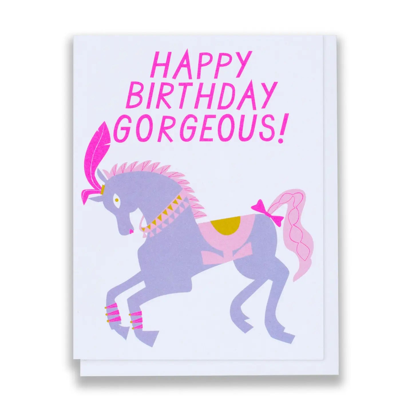 The world is divided it to two kinds of people, the ones who had a horse obsession and the ones who didn't. If you know the first kind, you can do no wrong with this pretty prancing pony birthday card and it's happy birthday gorgeous greeting.