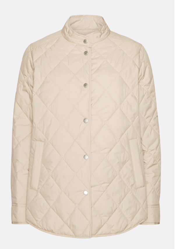 A padded jacket inspired by the classic over-shirt, featuring a diagonal quilted pattern. Designed with signature shirt details, including a yoke with a center-back pleat, a Chinese collar, sleeve cuffs, and a curved hemline. Slanted jetted pockets offer both style and comfort, while logo buttons add a branded touch. Perfect as a lightweight layer under your raincoat or worn on its own as a relaxed, effortless jacket.