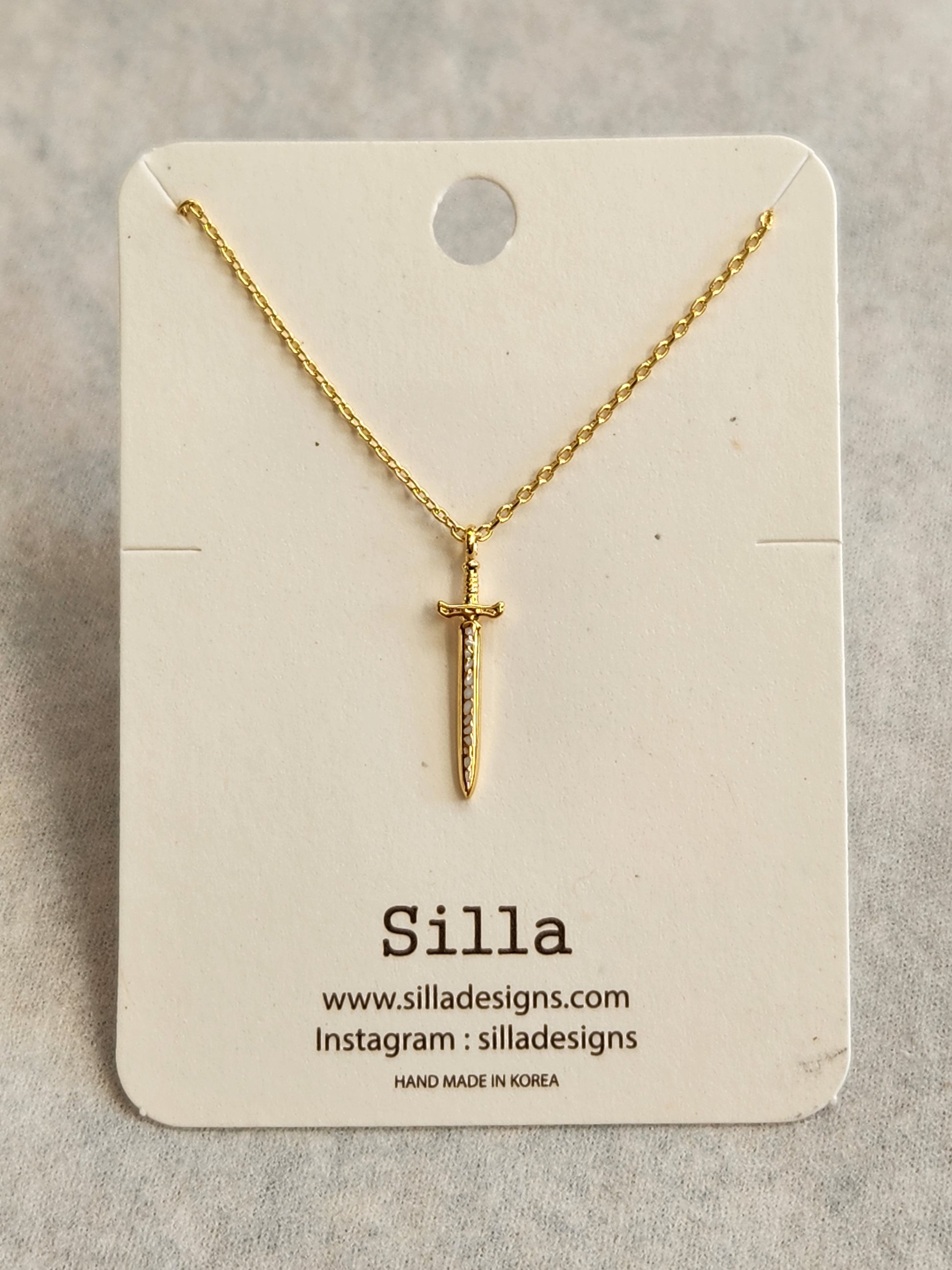 A refined pendant embodying quiet strength and elegance. This meticulously crafted small sword necklace suspends from a graceful chain, offering understated sophistication for the discerning wearer.