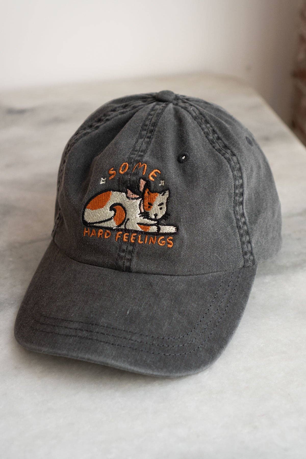 This cat is moderately displeased. Embroidery on a 6 panel unstructured baseball hat in pigment dyed vintage black. Adjustable strap back with metal clasp.