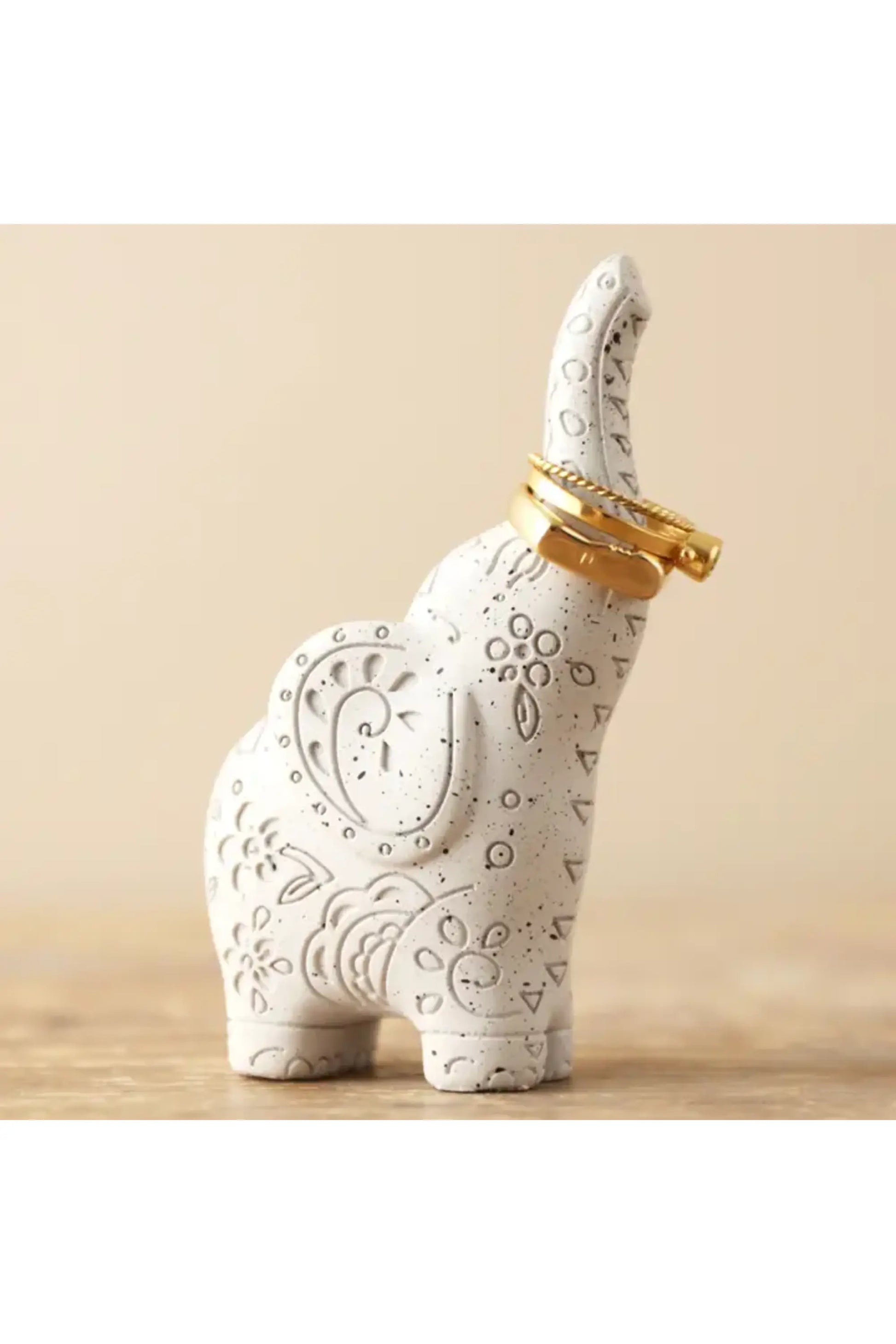A lovely little speckled elephant-shaped ring holder Made in a super smooth ceramic with ridges Featuring an intricate design of flowers and leaves With swirls and triangles forming a gorgeous pattern And a long trunk with plenty of room for ring stacking