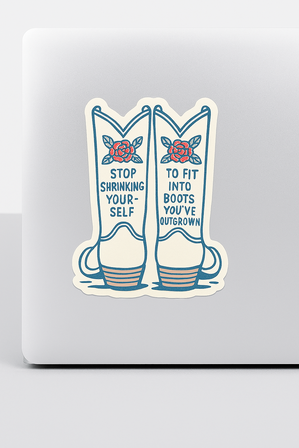 Bold, beautiful, and unapologetically outgrown. This empowering vinyl sticker features a pair of hand-drawn white cowgirl boots with blooming floral details and the message: "Stop shrinking yourself to fit into boots you've outgrown." A reminder to own your growth, your space, and your power—with a Western twist.