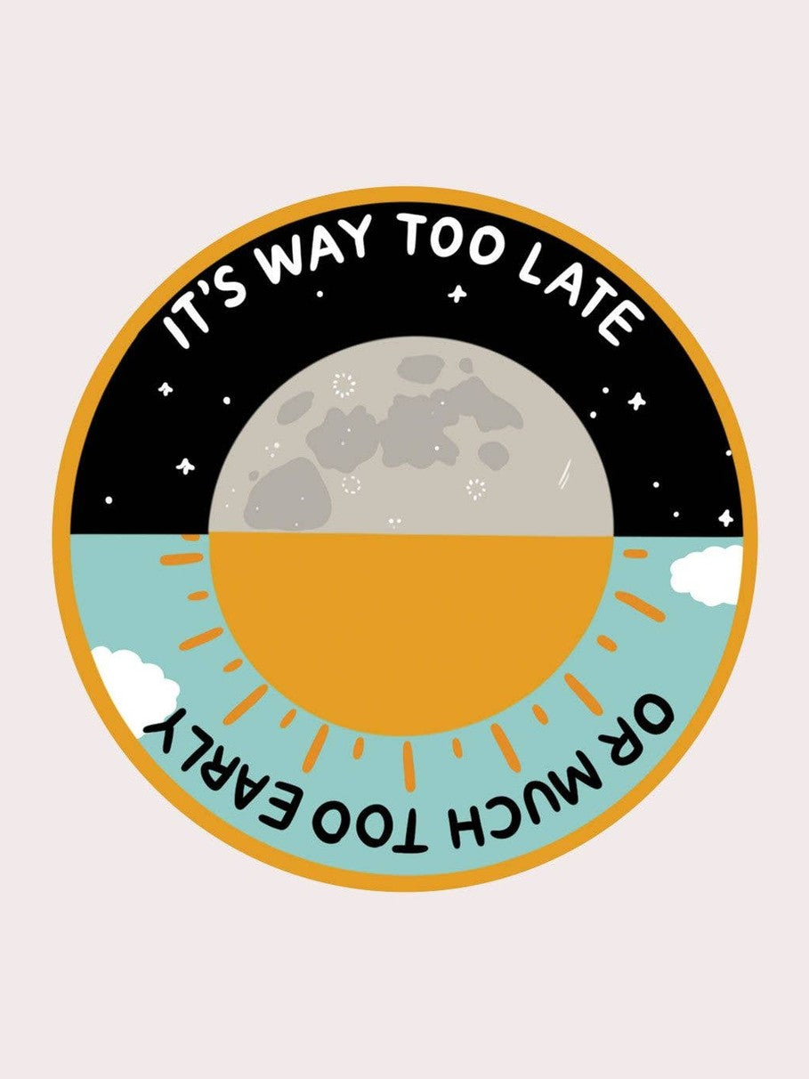 Don't miss out on this Way Too Late Vinyl Sticker! This trendy sticker is perfect for your laptop, water bottle, or any other surface you want to personalize. Show off your style and humor with this bold and eye-catching design.
