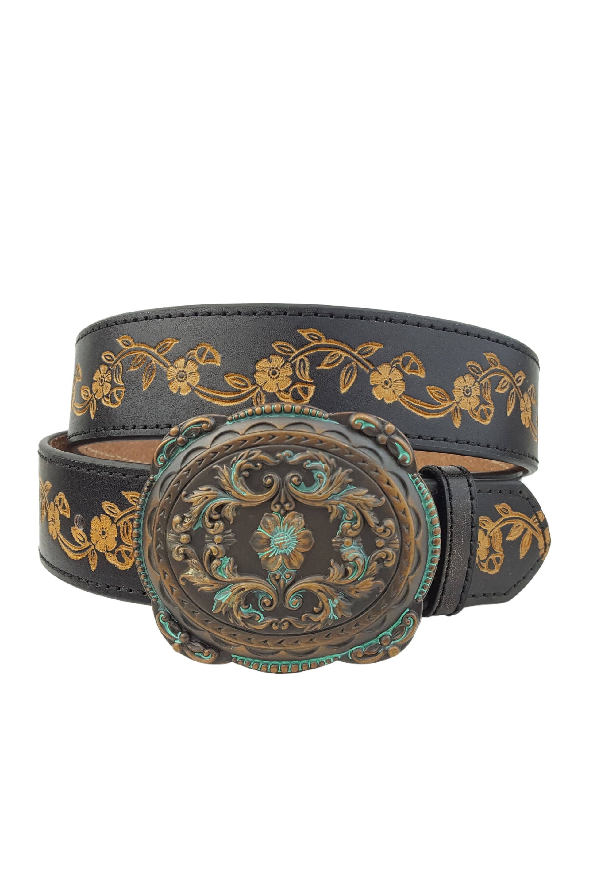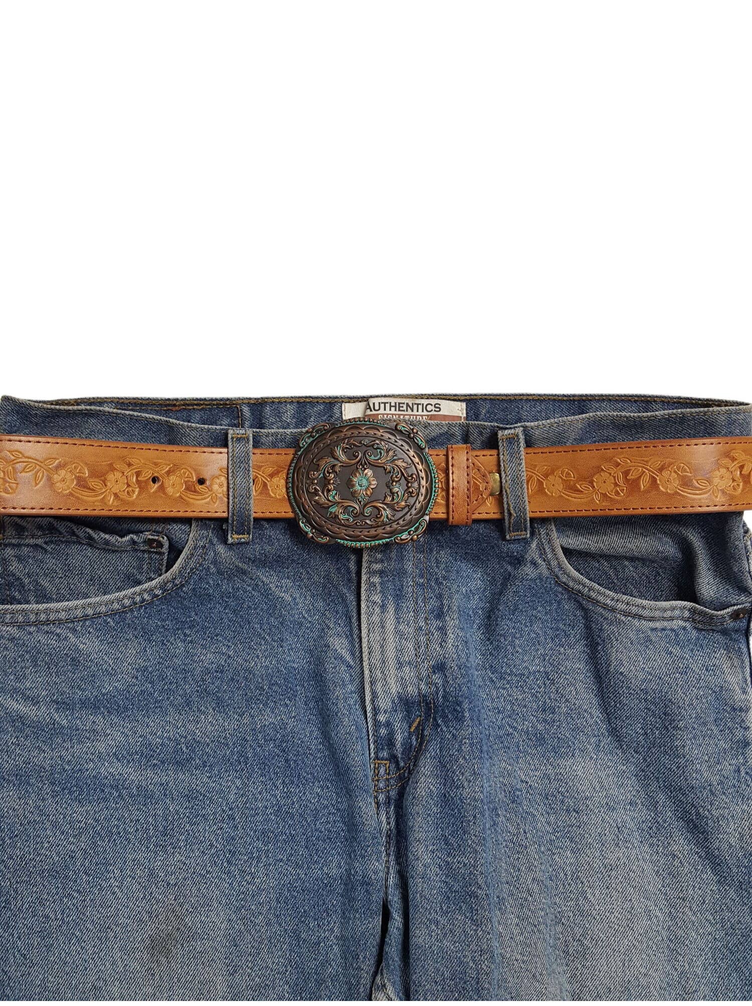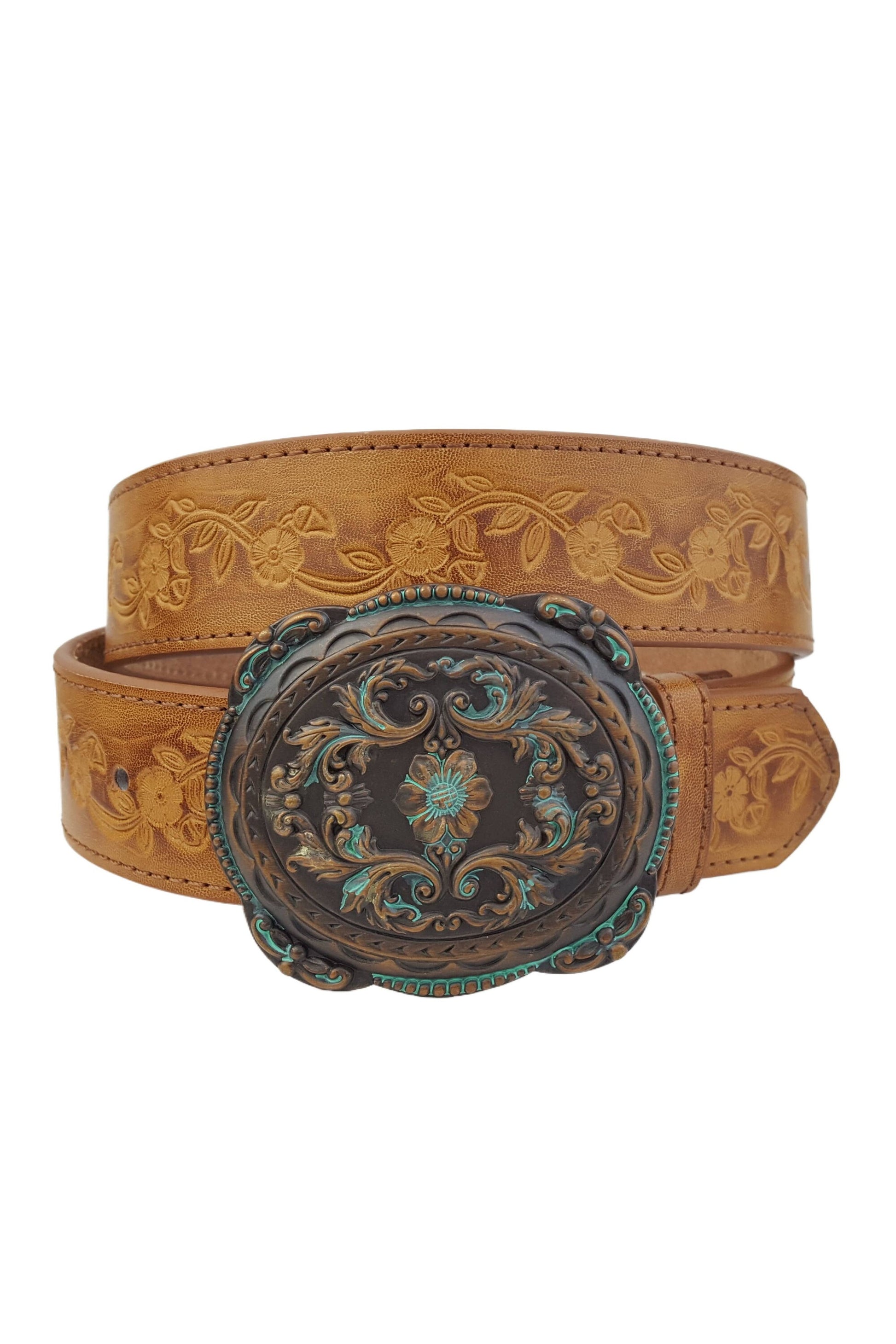 Western Brass/Patina Buckle with Vintage floral tooled belt