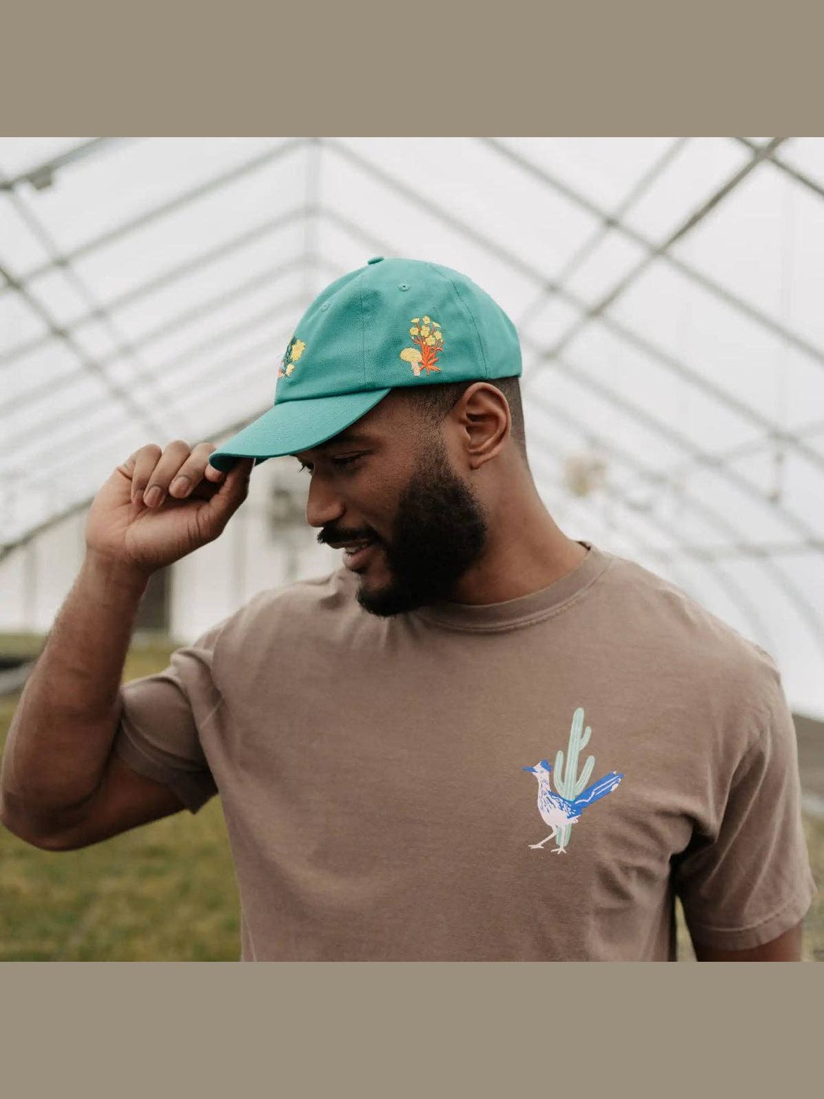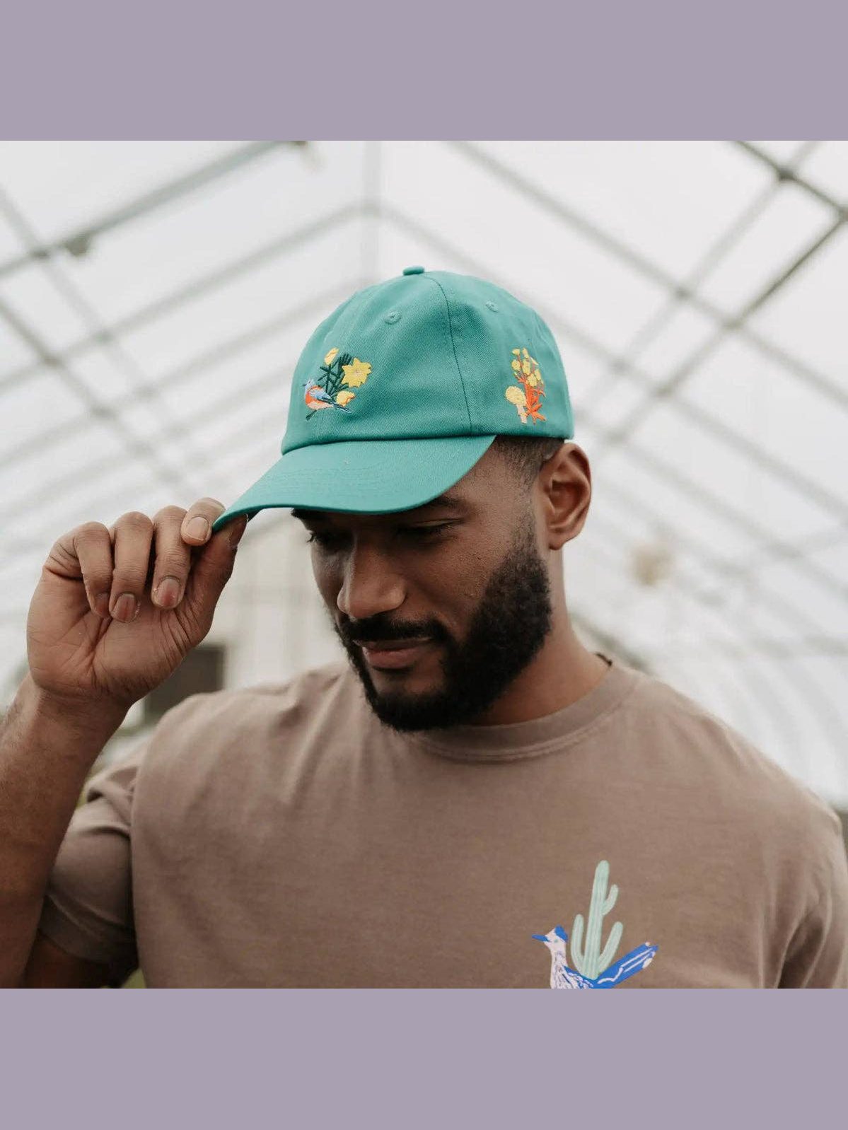 Top off your look with a hat inspired by the Western landscape, featuring an embroidered Western Bluebird among native flowers and mushrooms.