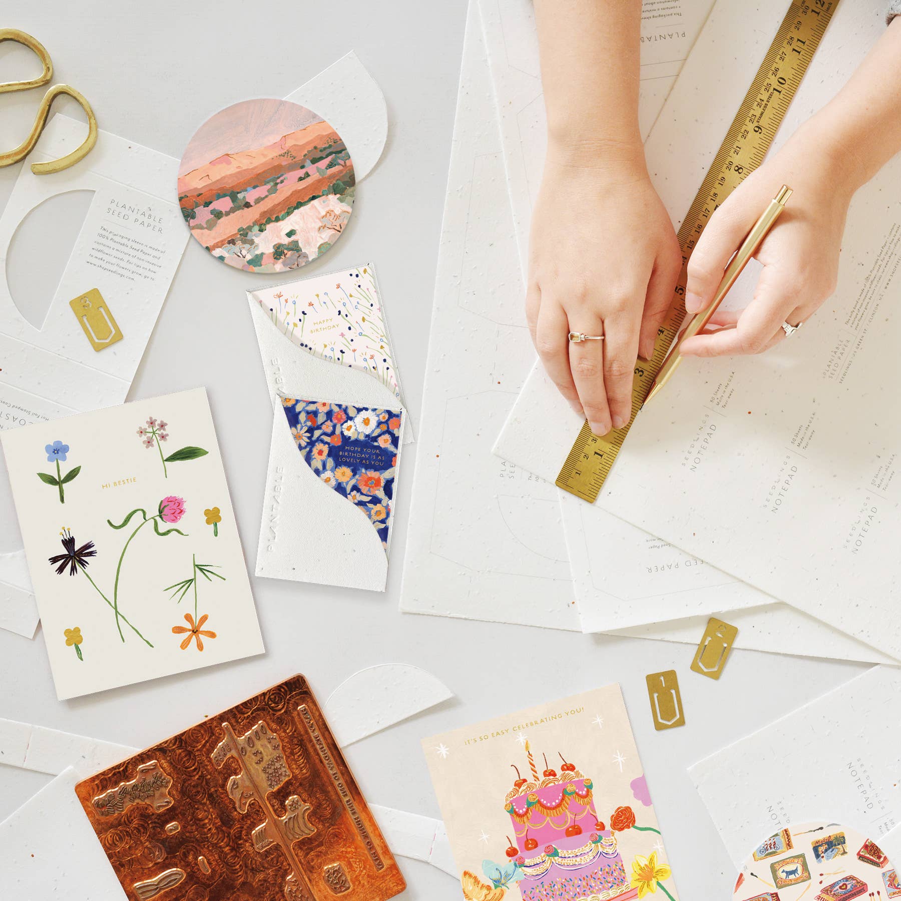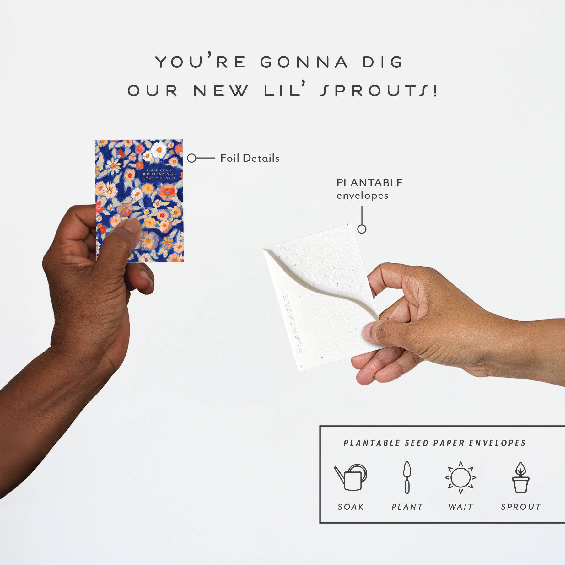 Meet the newest little SPROUT! Think all the goodness of our full size greeting card BUT at a petite "mini me" and super cute enclosure card size. All Seedlings sprouts have foil details and a PLANTABLE seed paper envelope which is embedded with wildflower seeds. This seed paper is made of a biodegradable eco-paper created with post-consumer materials - no trees harmed for this paper! When planted, our envelopes compost away leaving only flowers behind. Blank inside, our mini greeting cards are printed on premium paper and are all accented with foil details. Need a display? Order SPRDIS24 for a 24 pocket tabletop spinner. Card size: 2.5" x 3.5" All Seedlings cards are made in the U.S.A.